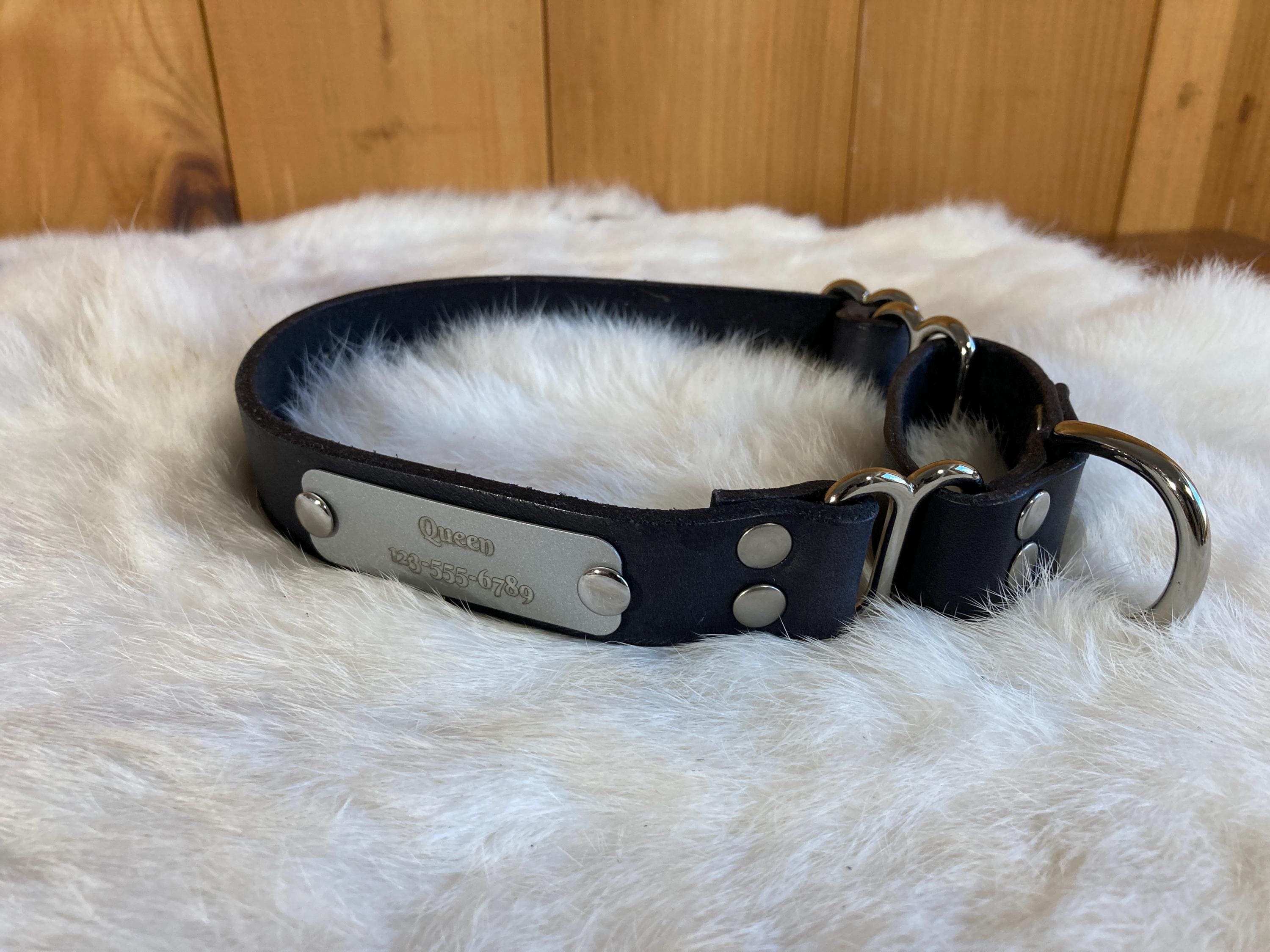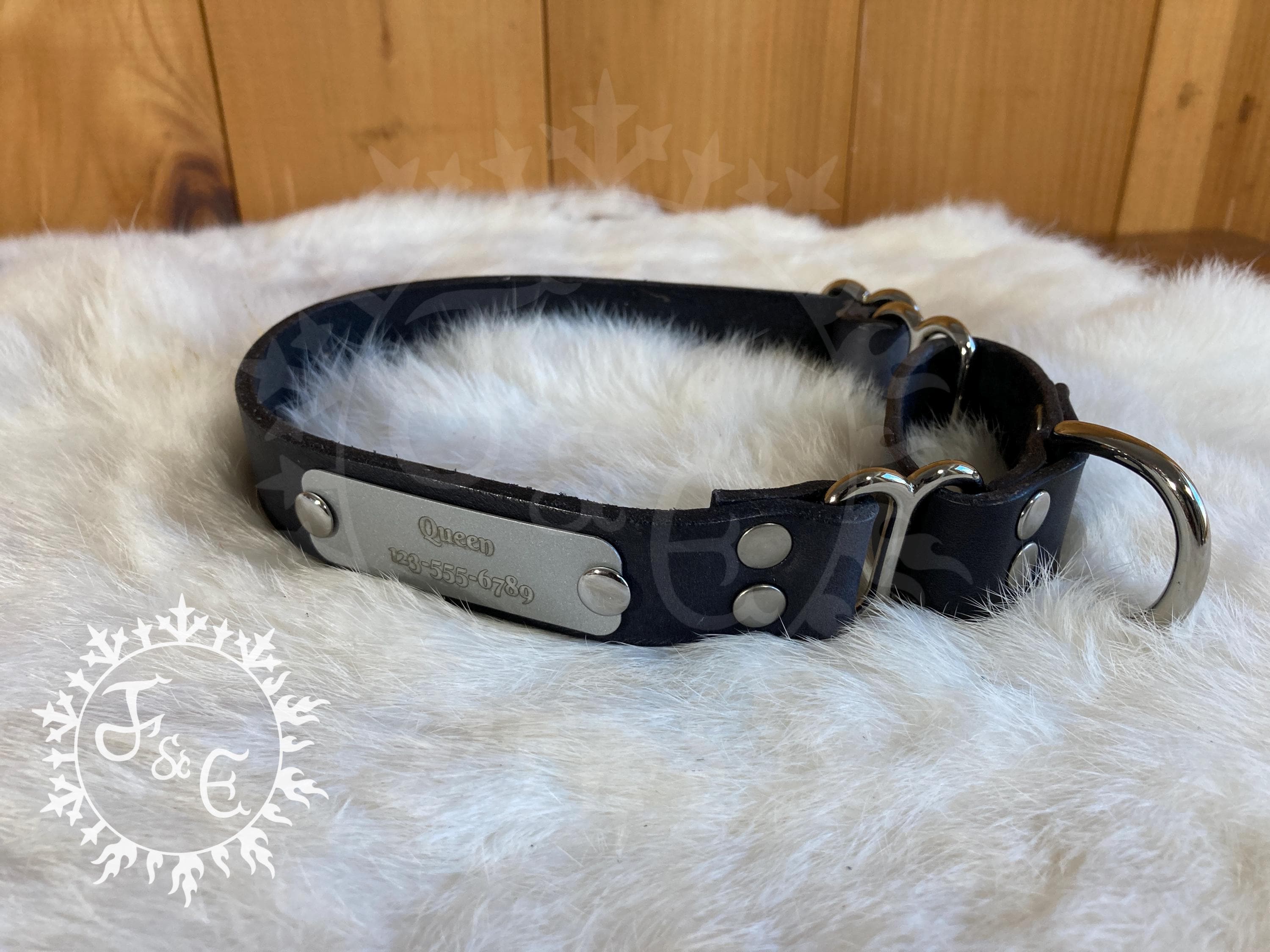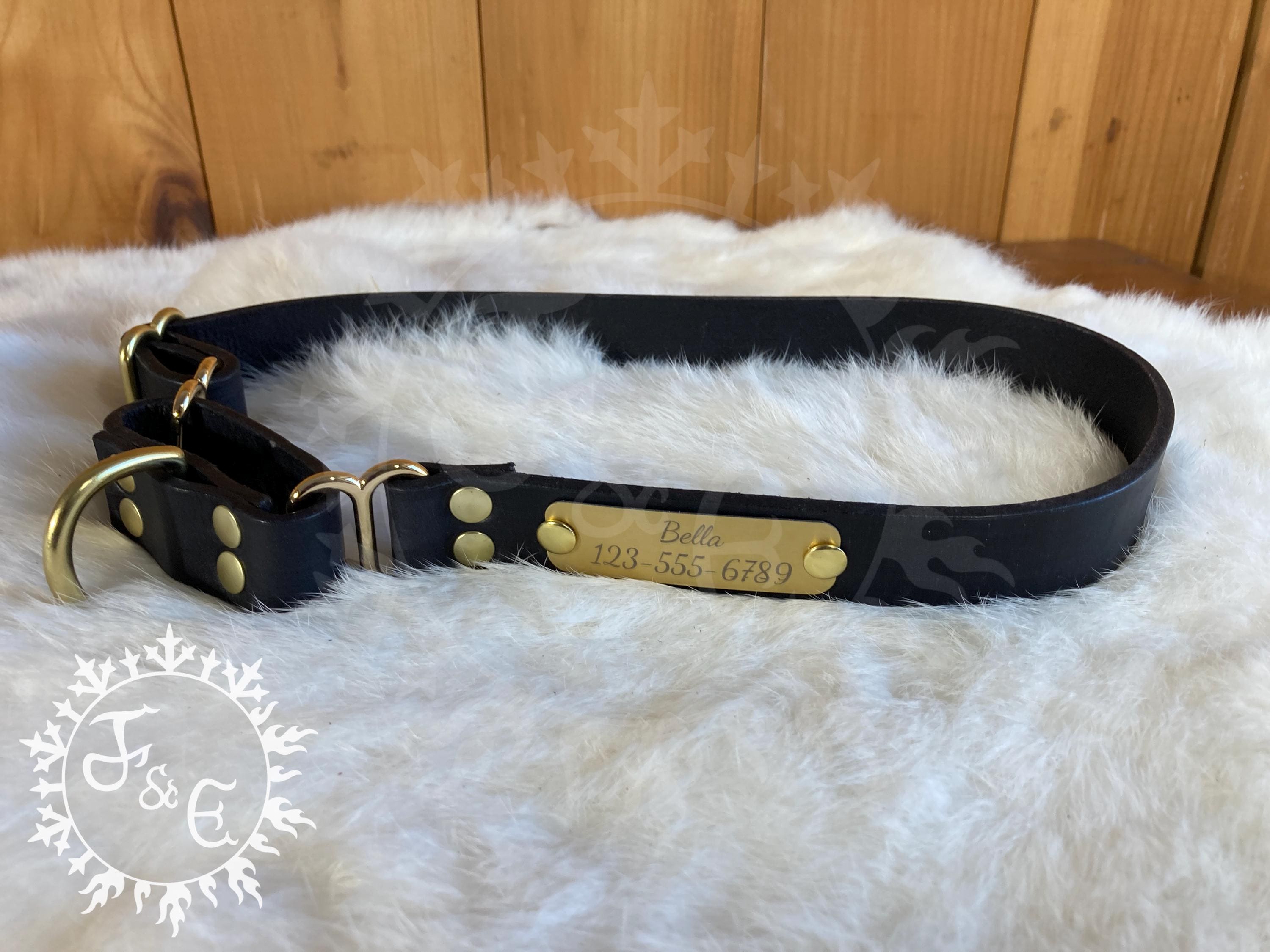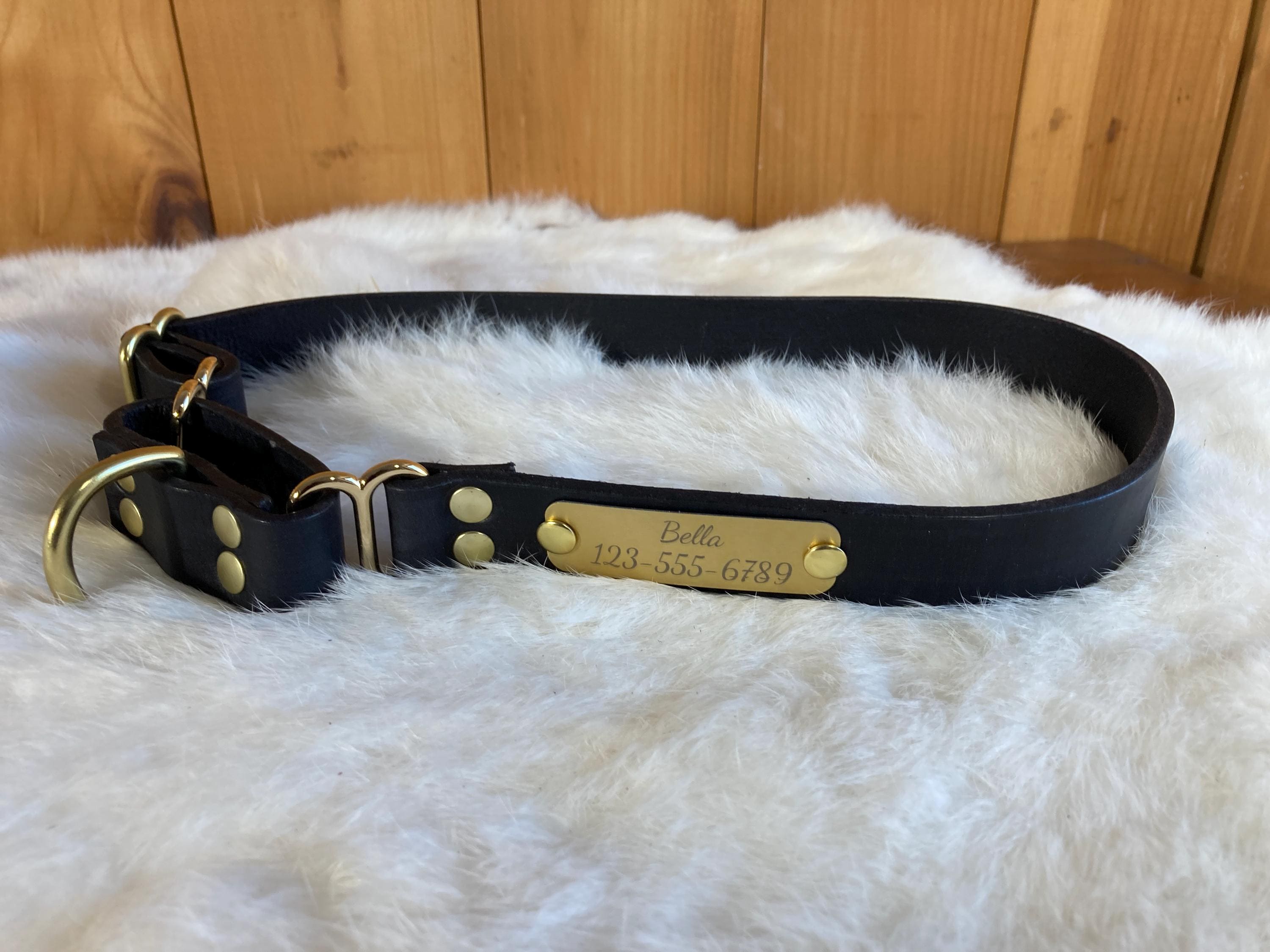 We can fit a name and phone number on any of our 1.5" wide or 2" wide martingales! Please send us a message to confirm if the name and phone number you have will fit on any of the 1" wide collars. They can be a little trickier, because space is more limited.