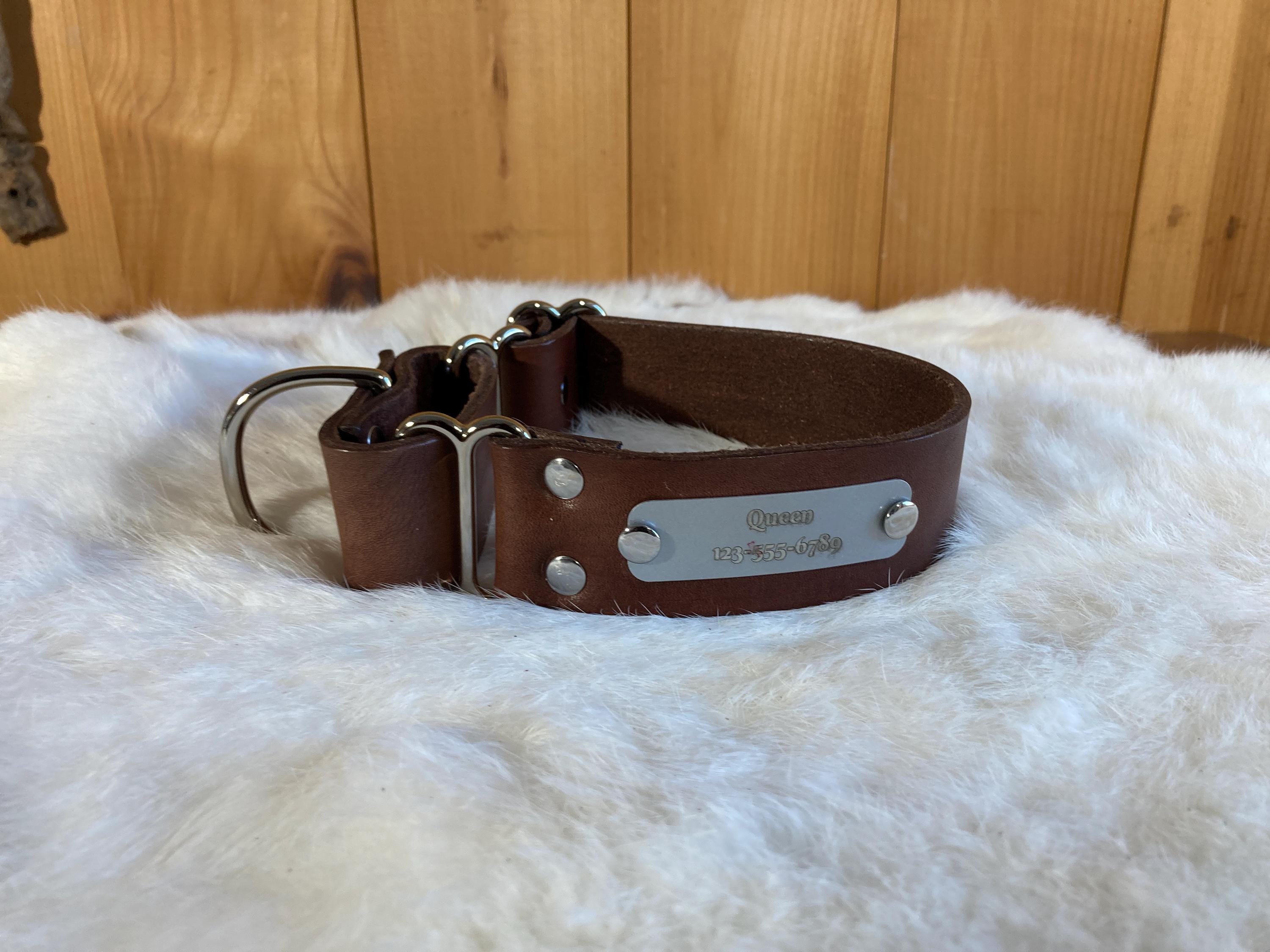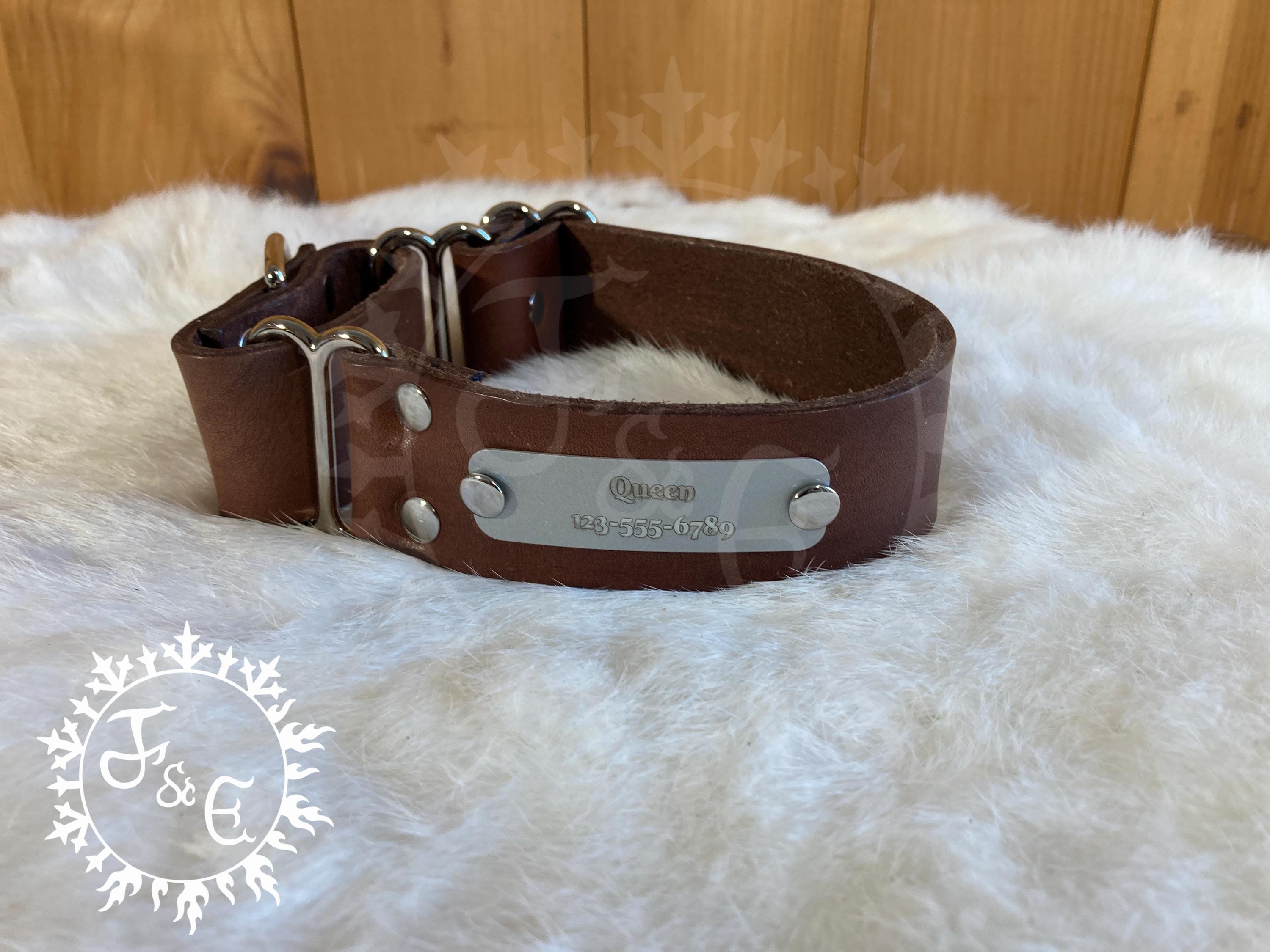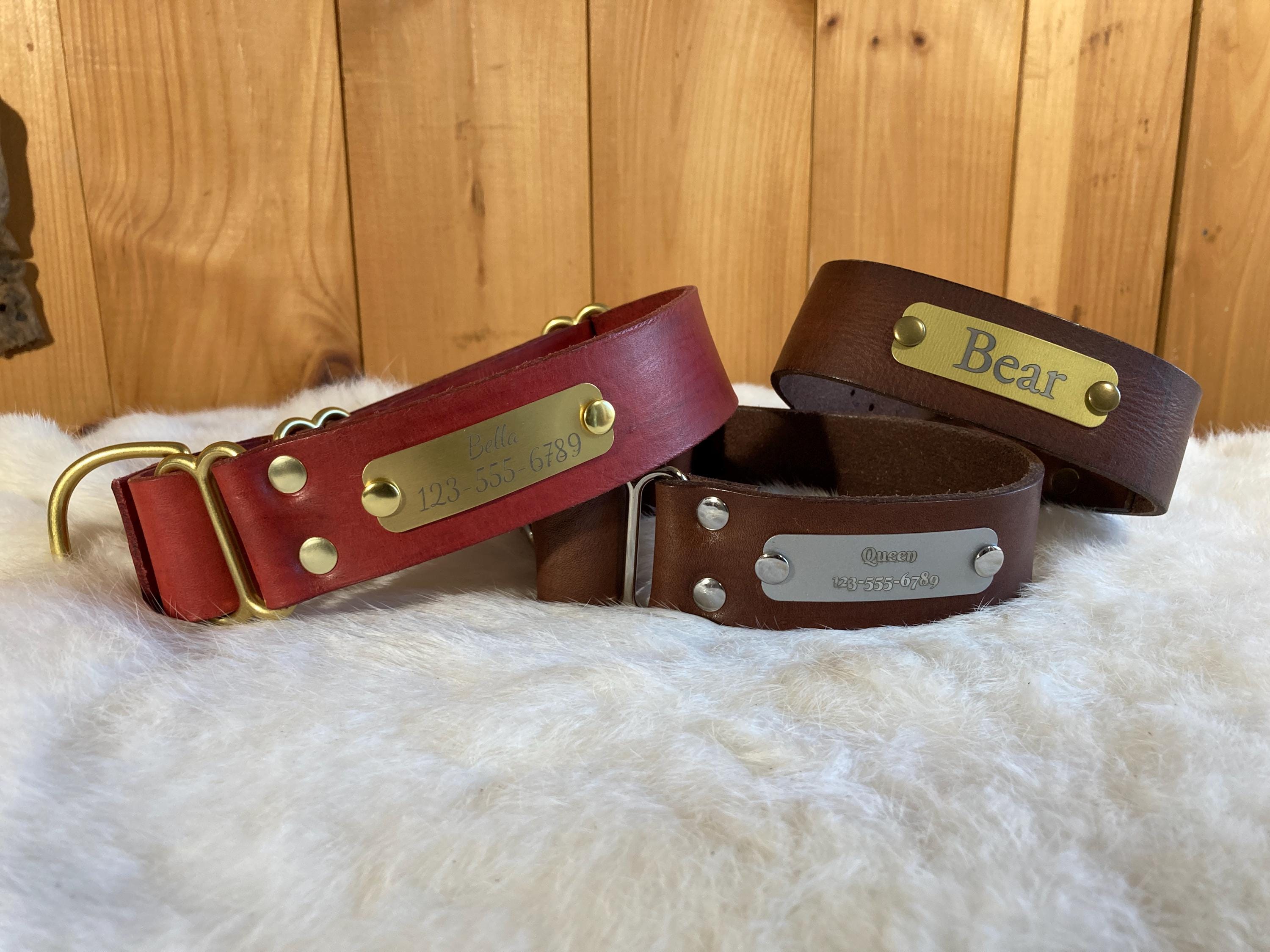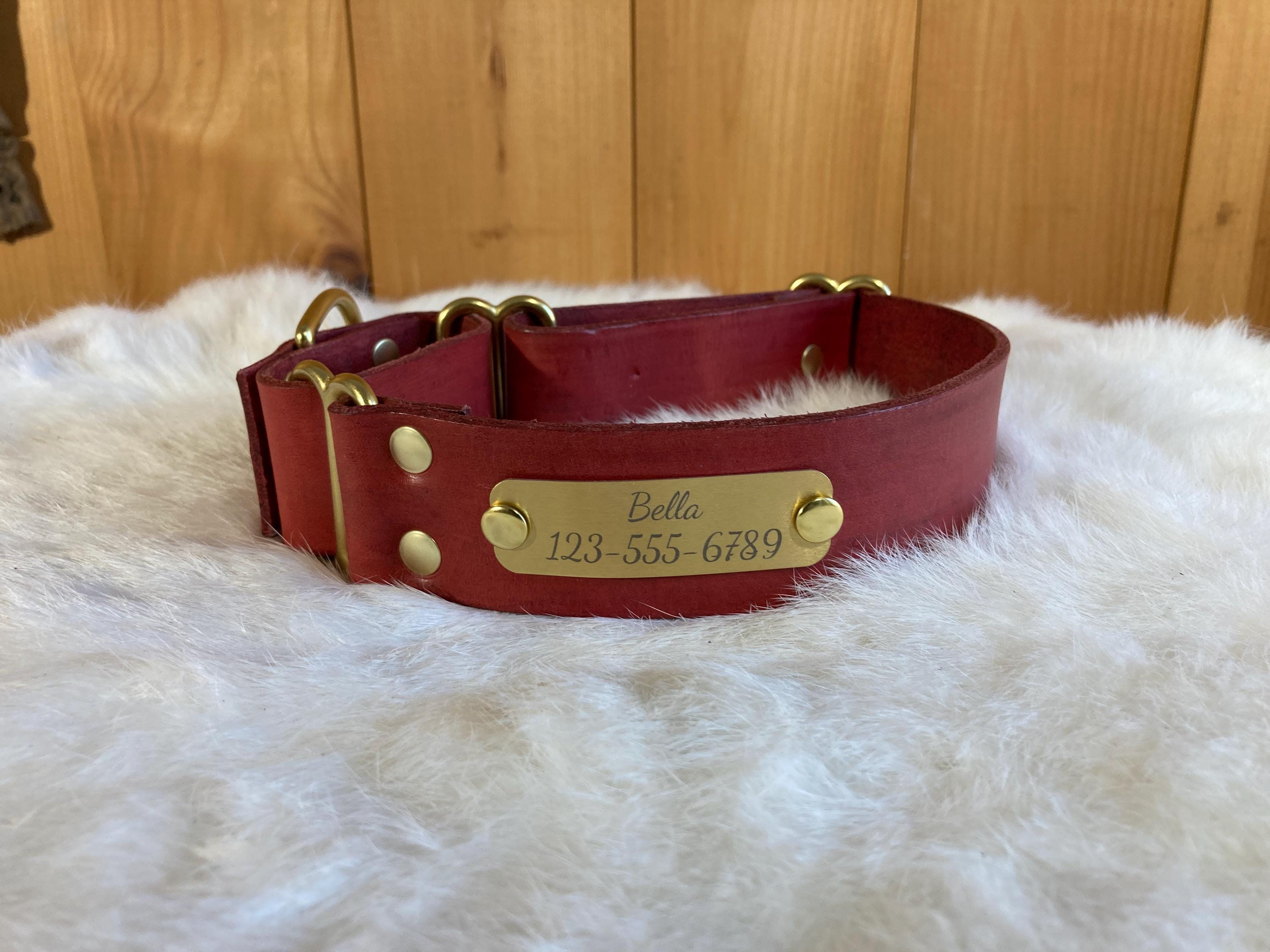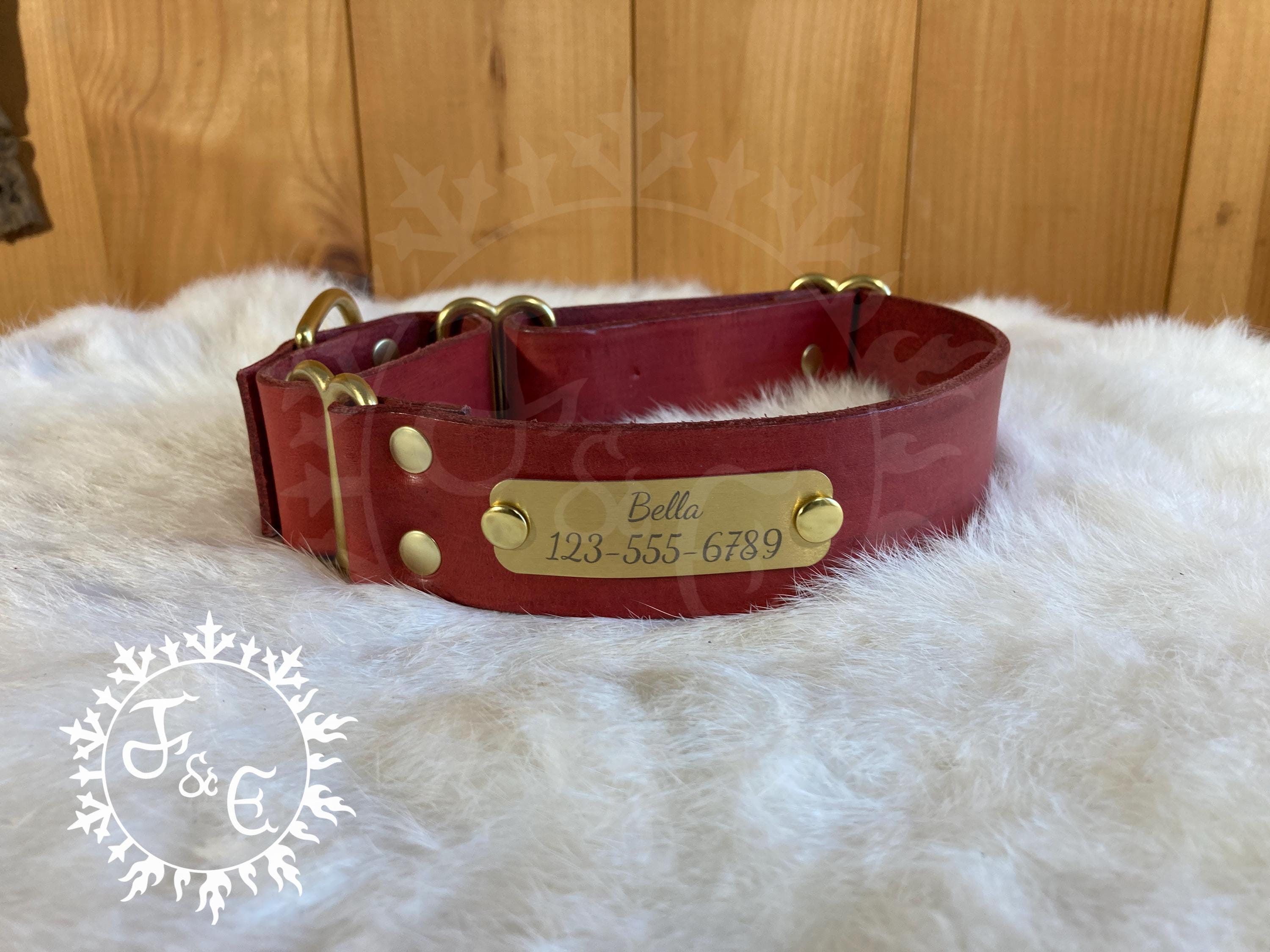 We can fit a name and phone number on any of our 1.5" wide or 2" wide martingales! Please send us a message to confirm if the name and phone number you have will fit on any of the 1" wide collars. They can be a little trickier, because space is more limited.