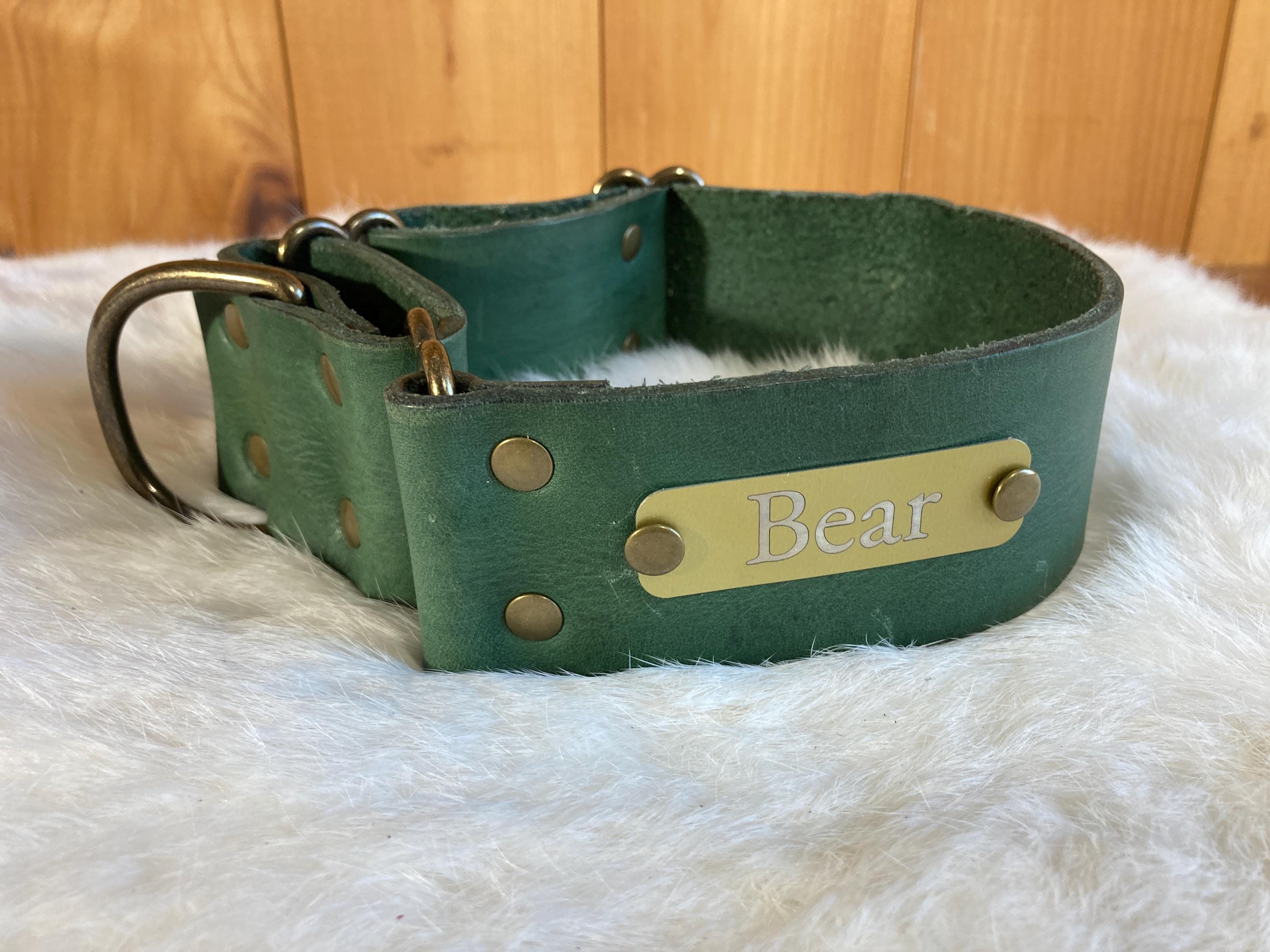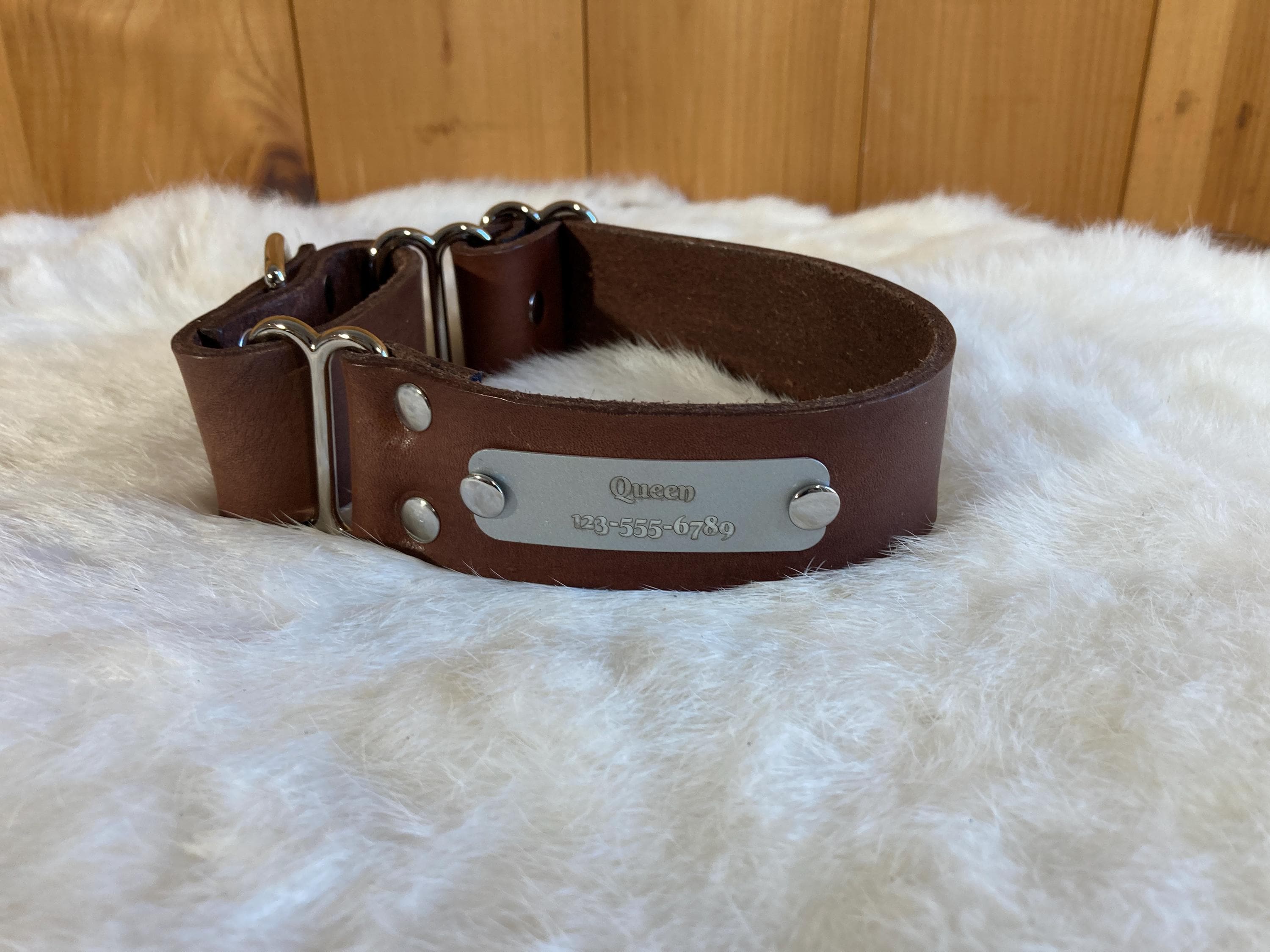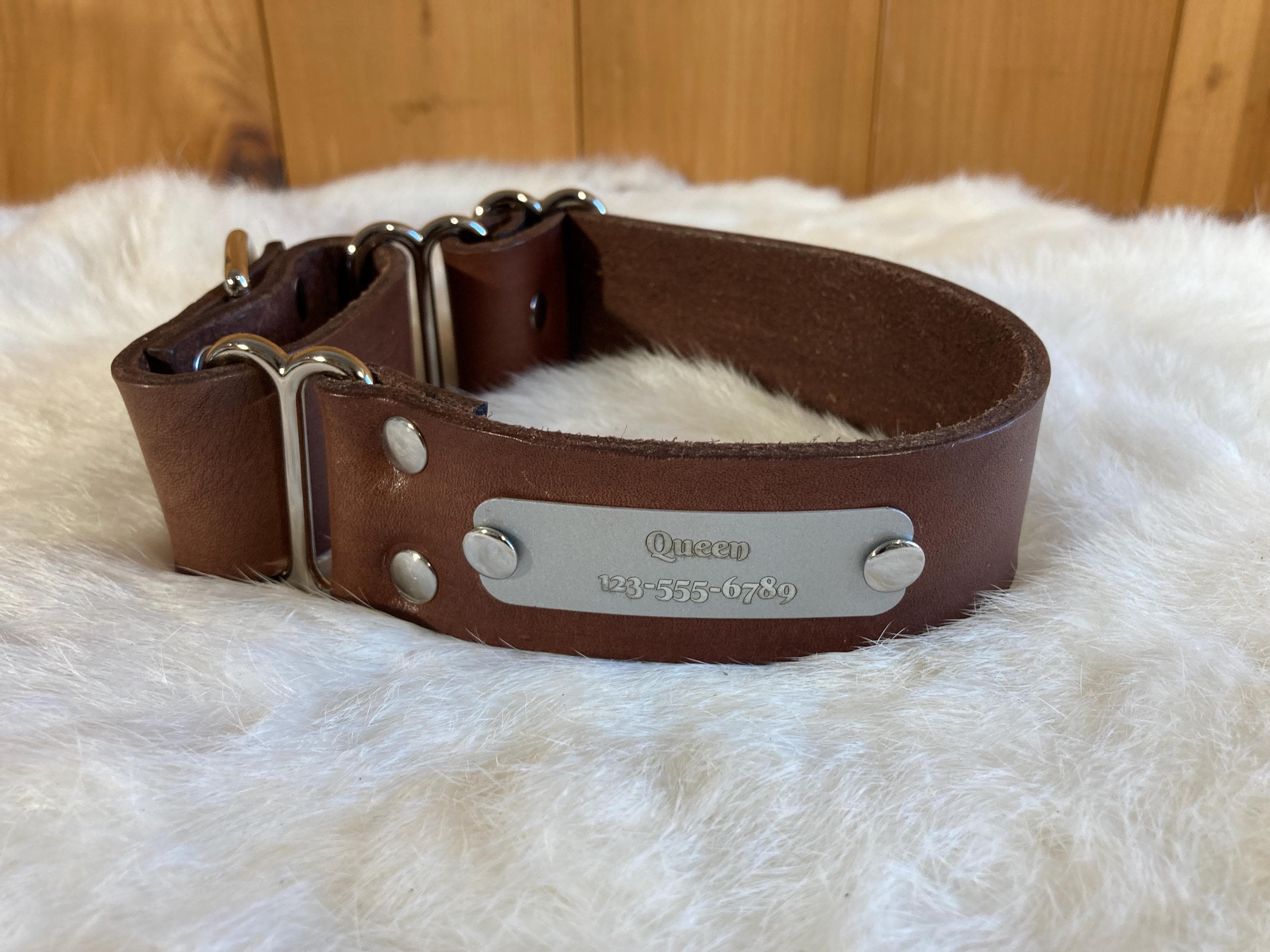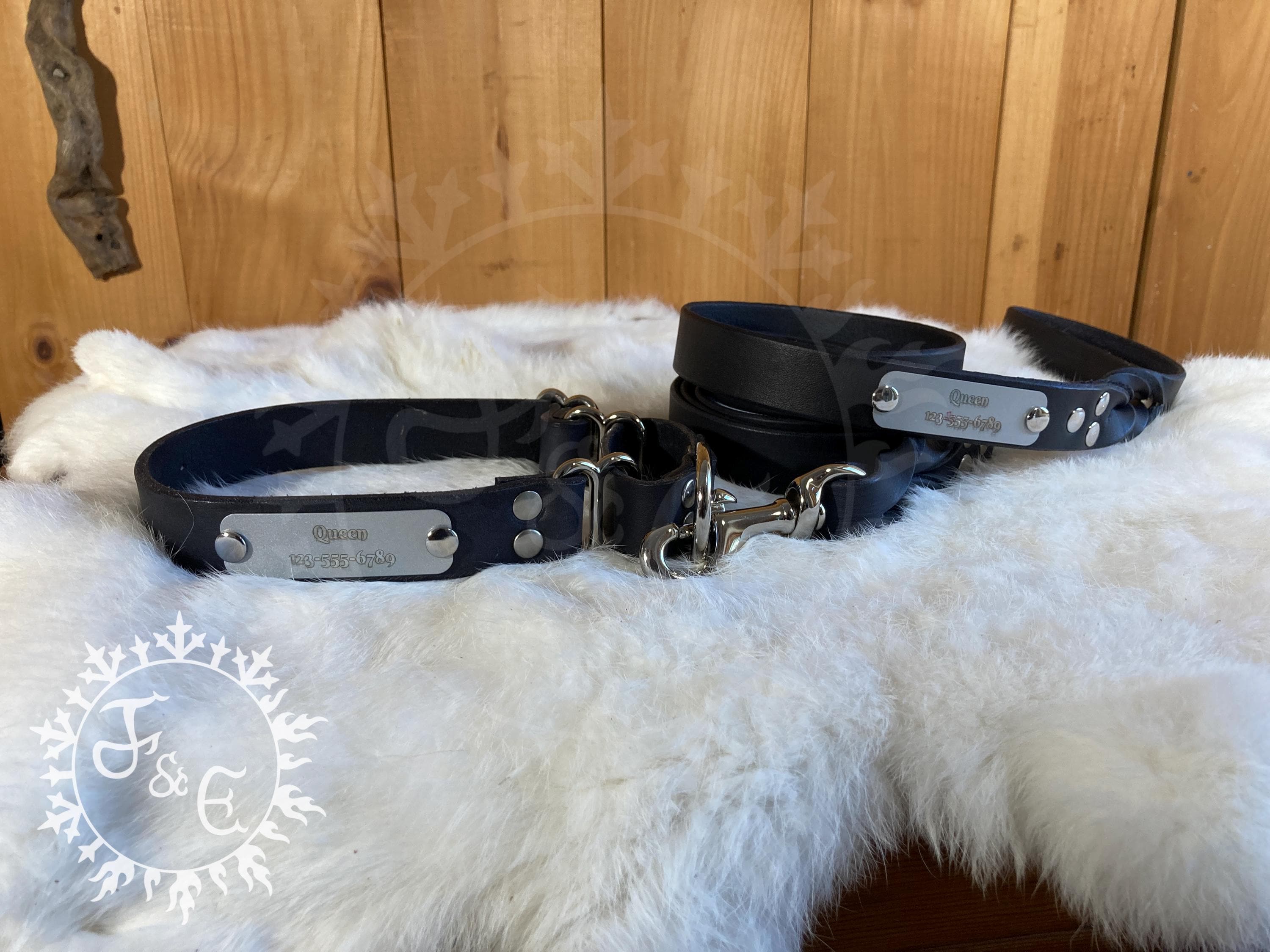 We can fit a name and phone number on any of our 1.5" wide or 2" wide martingales! Please send us a message to confirm if the name and phone number you have will fit on any of the 1" wide collars. They can be a little trickier, because space is more limited.