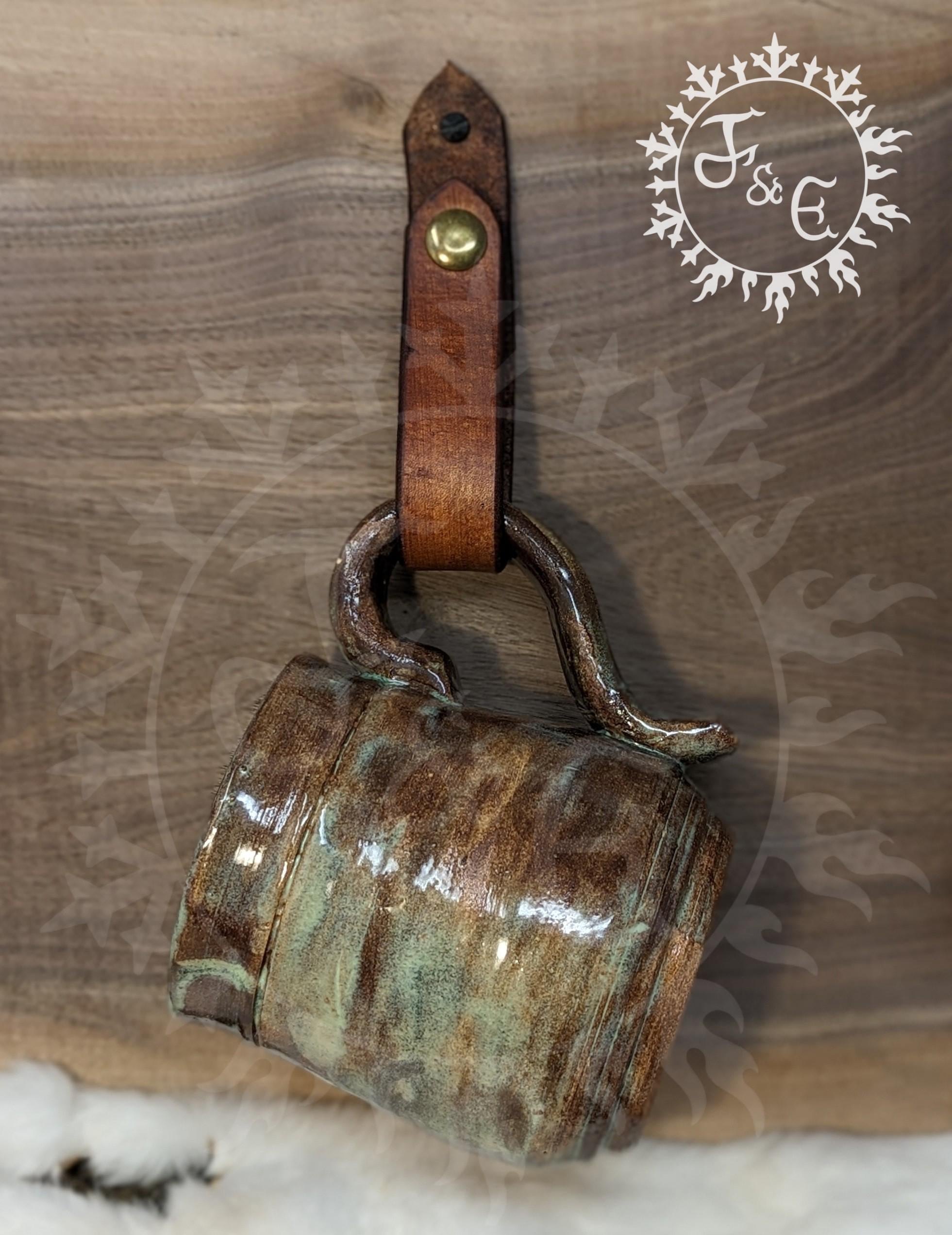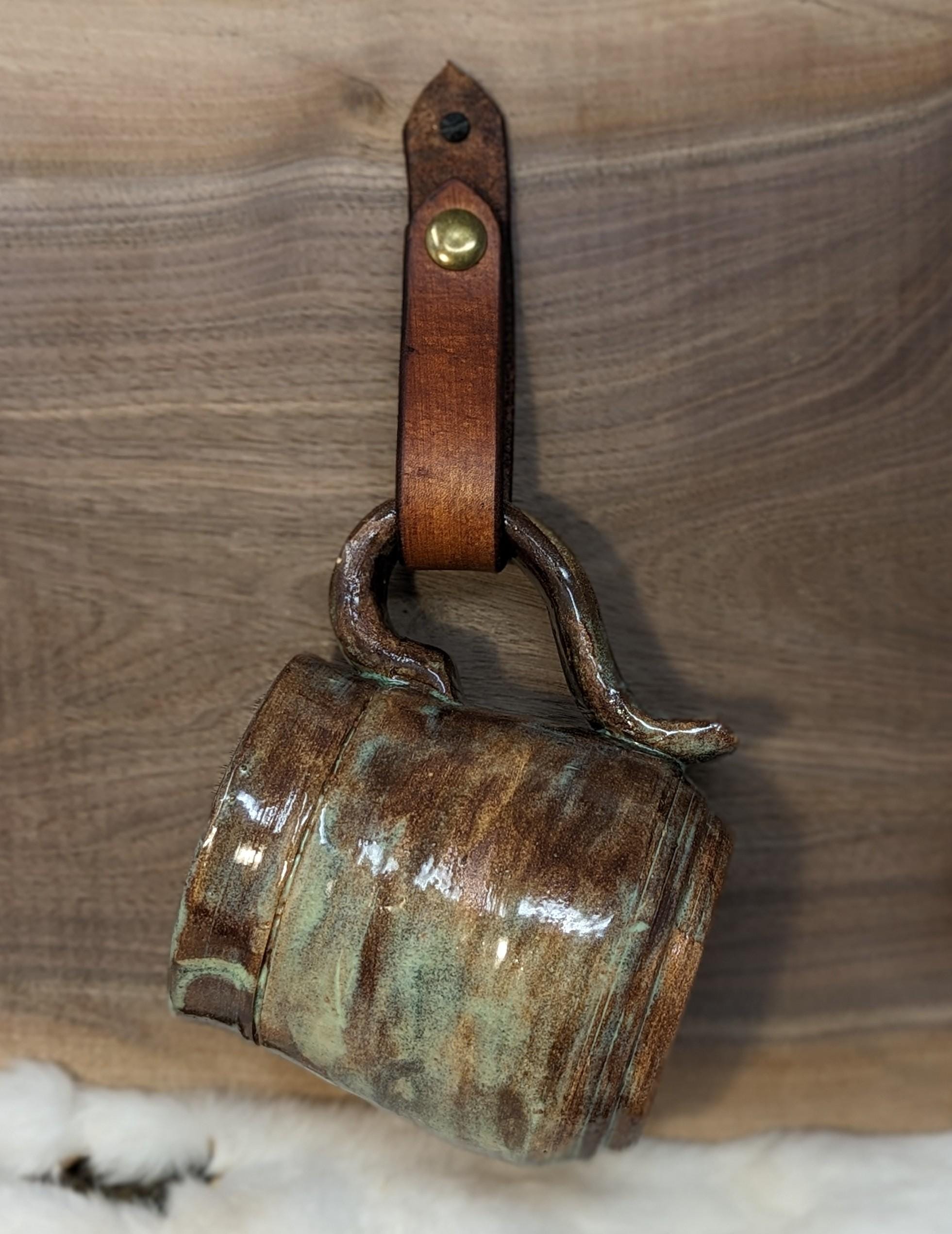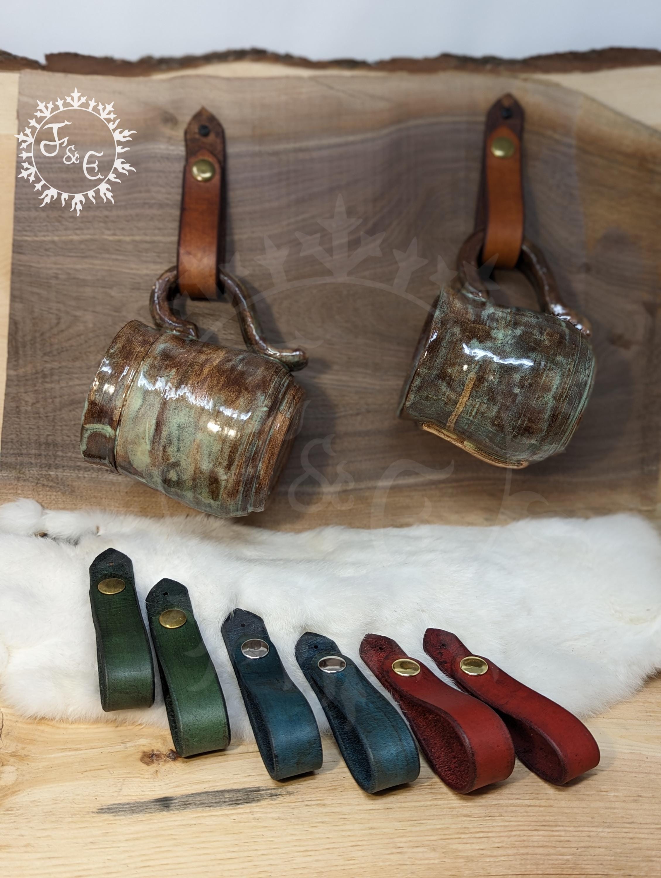 - Long leather strap to wrap around mug handles or small towels