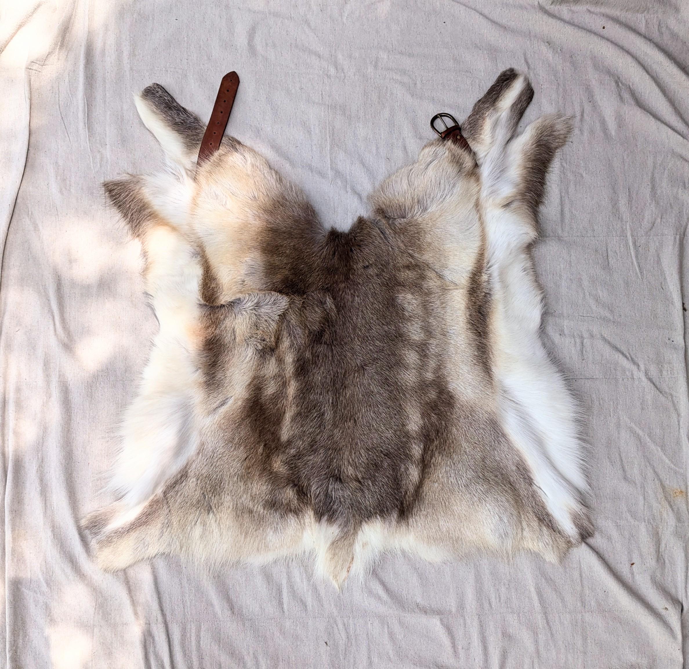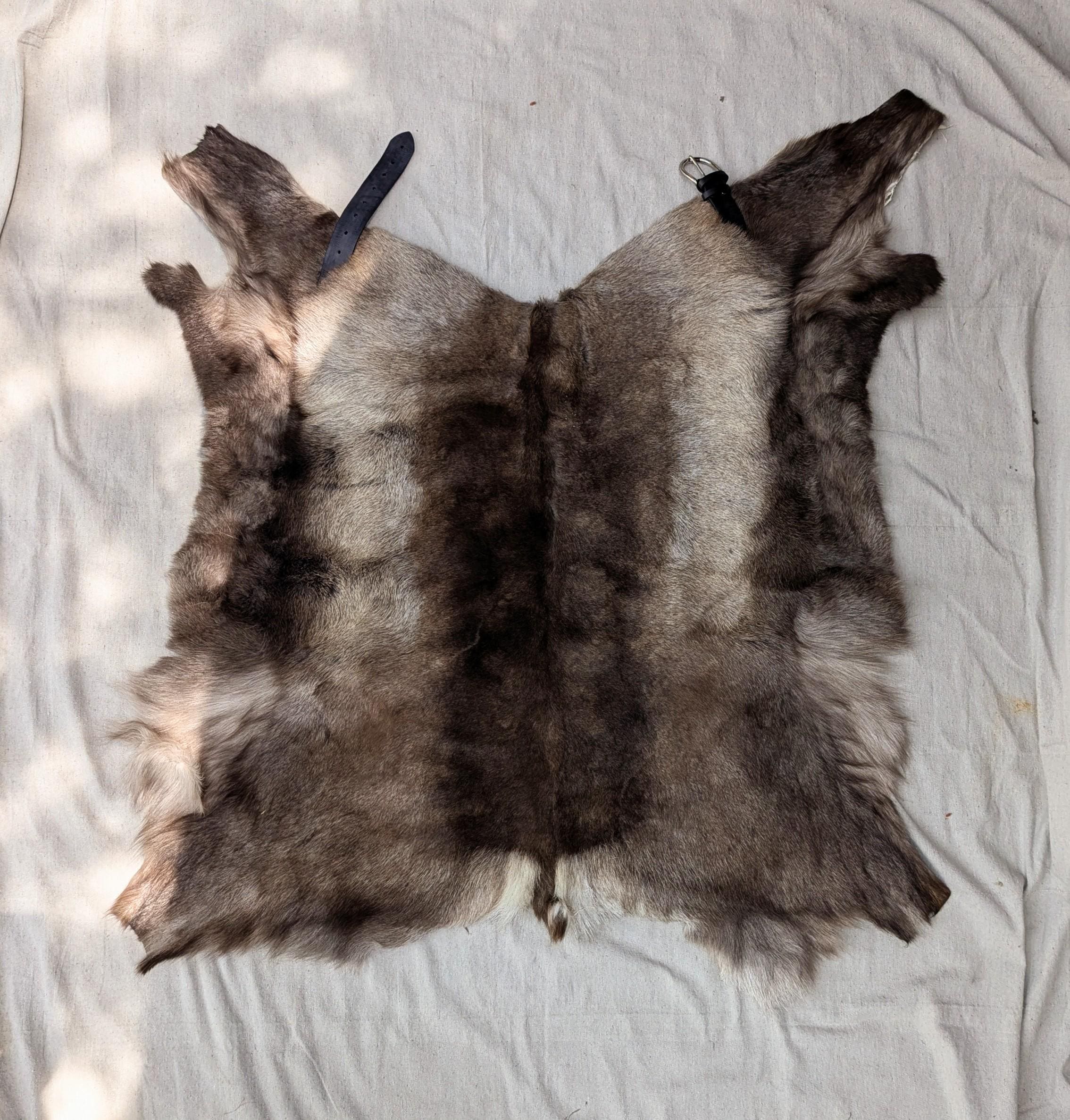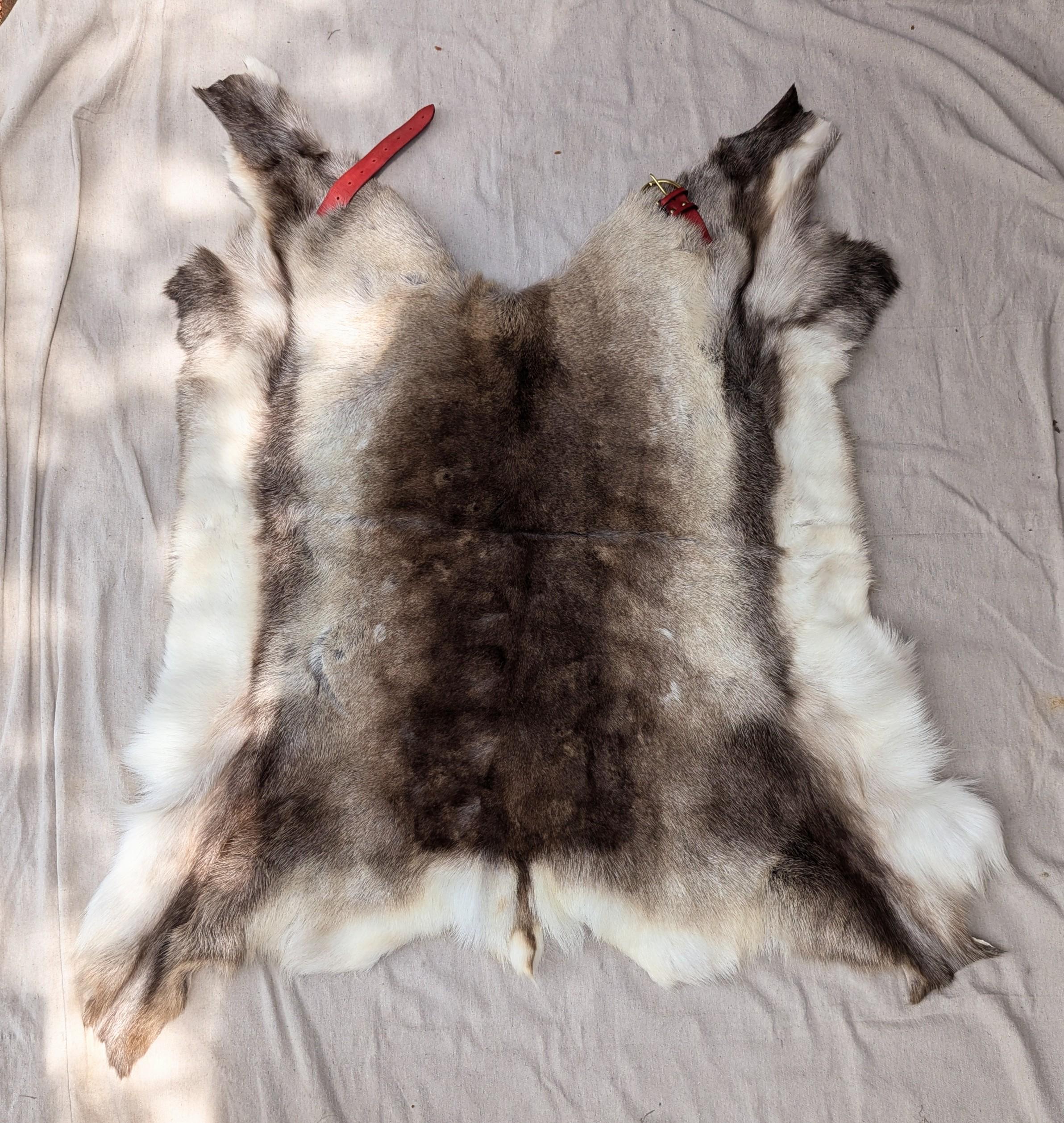 This is a listing for one reindeer pelt cut to be a cloak/cape with a buckle at the front.