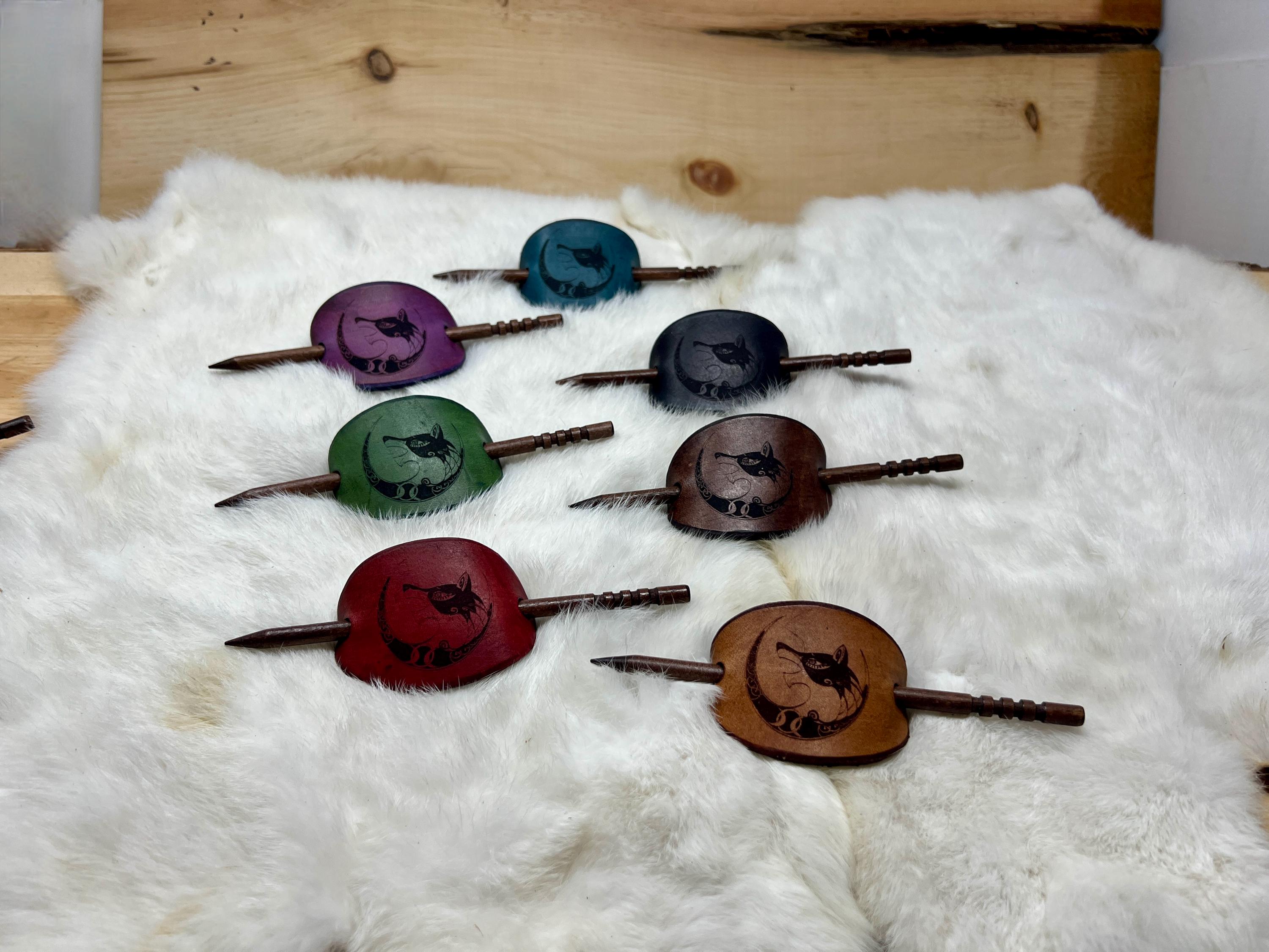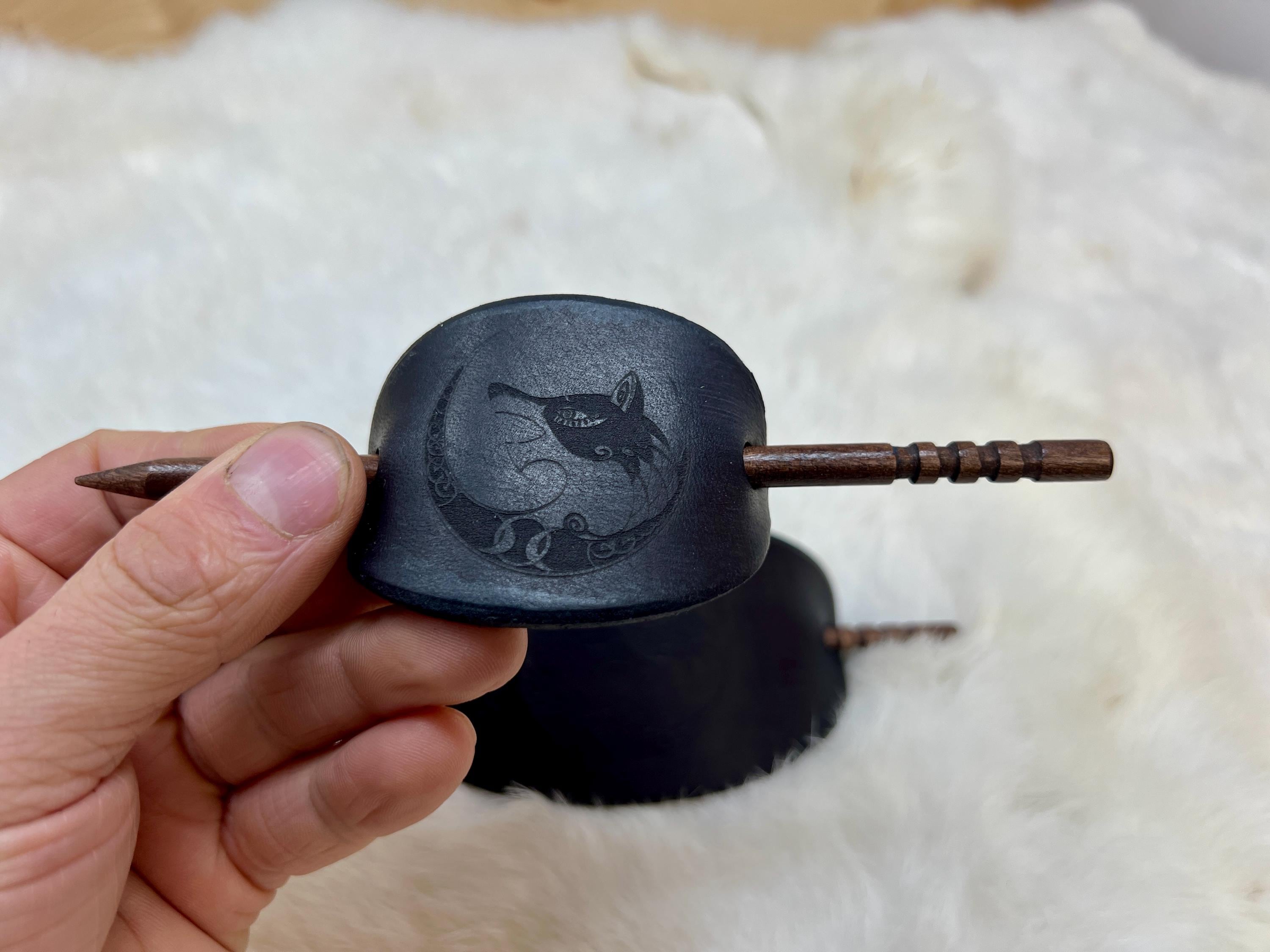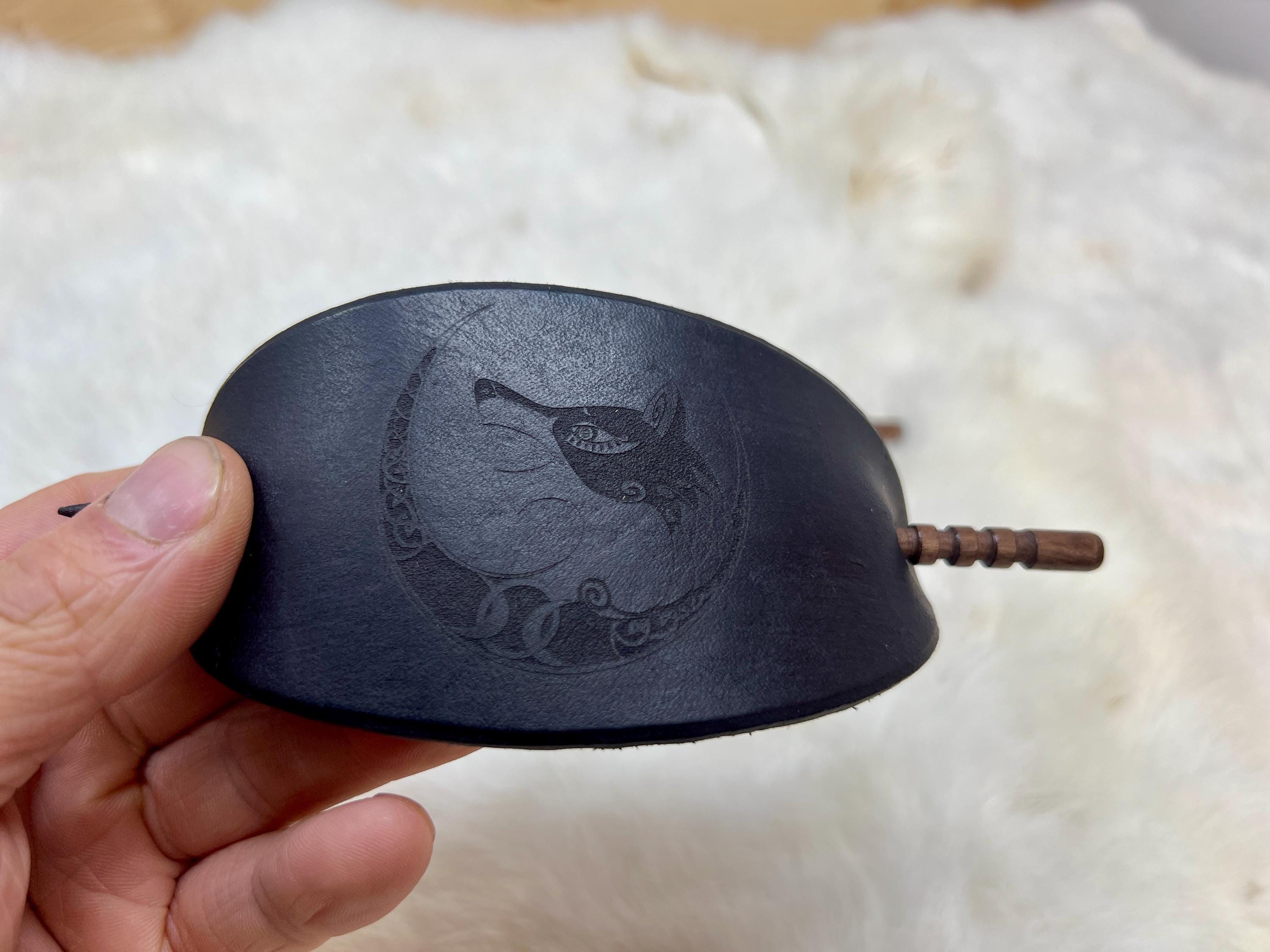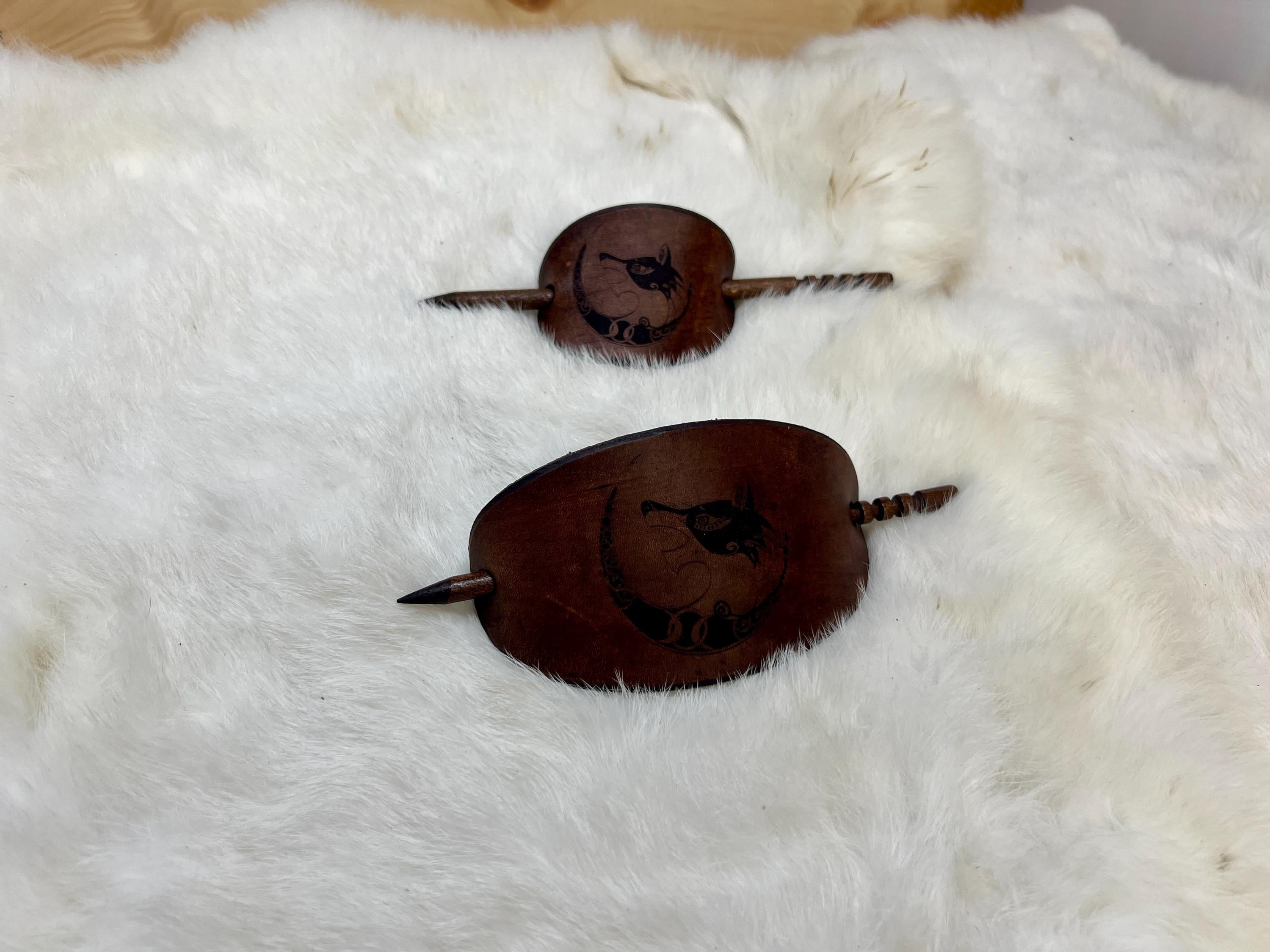 - Leather hair pin engraved with a unique Wolf Howling in a Crescent Moon art