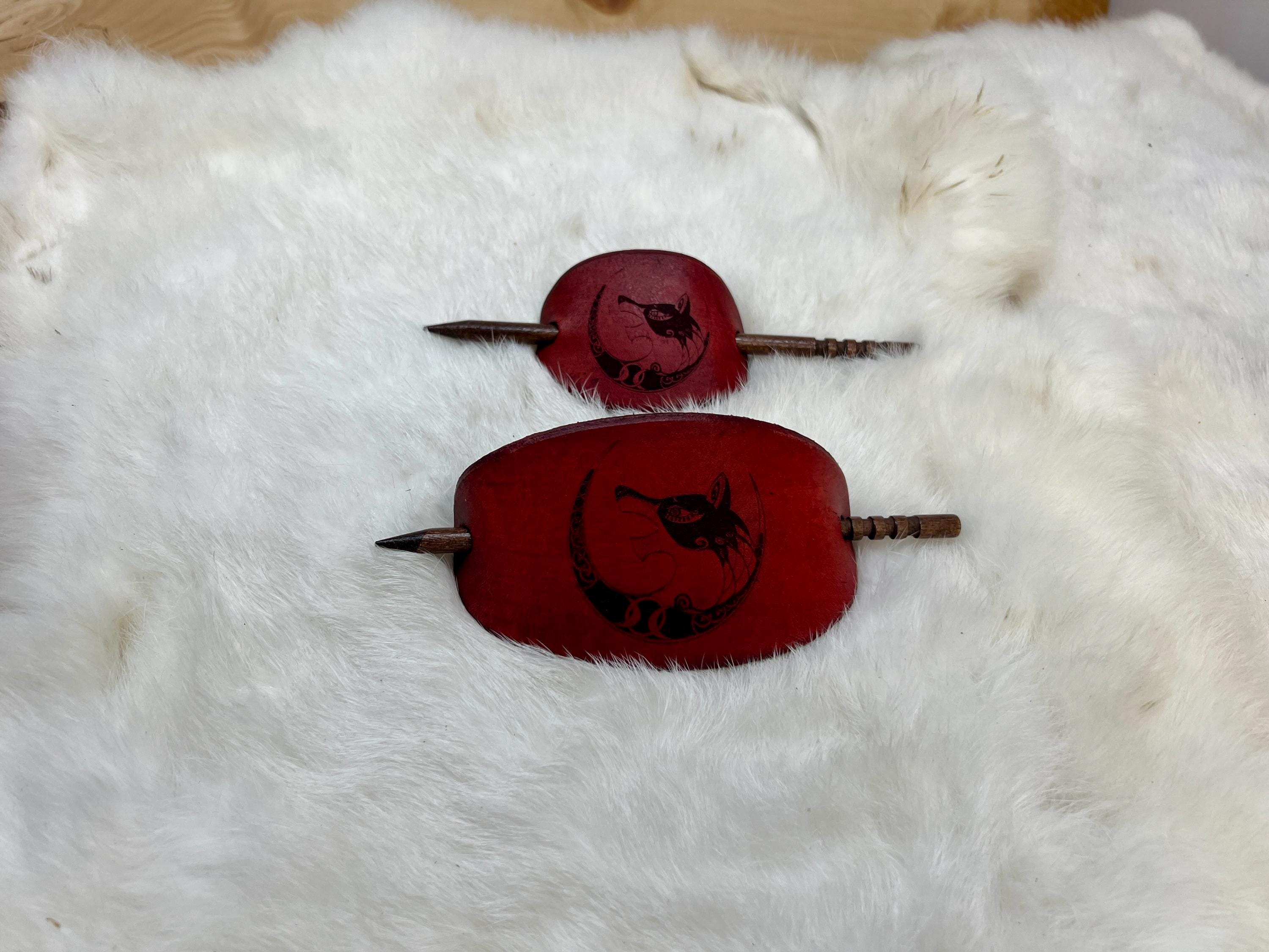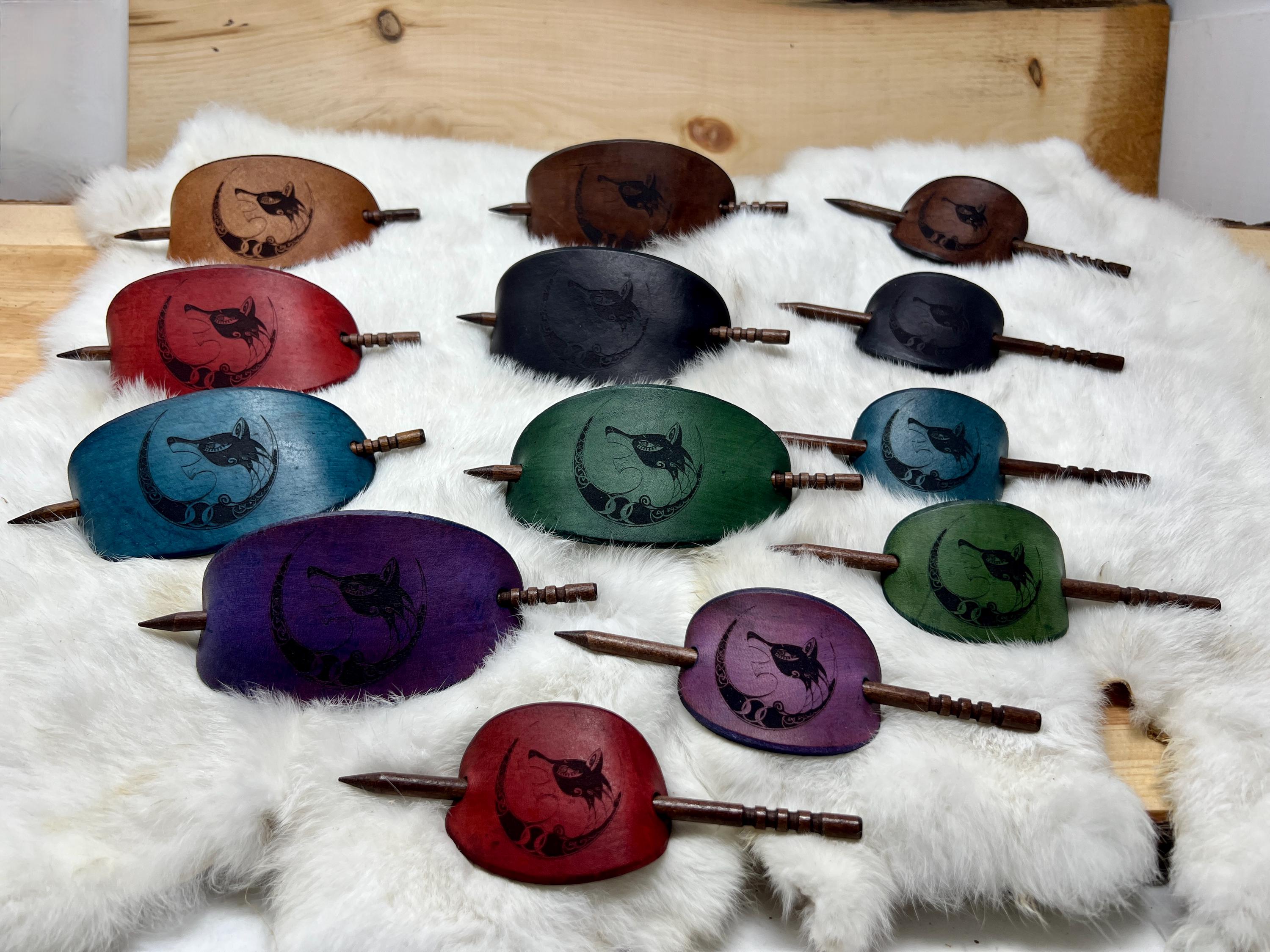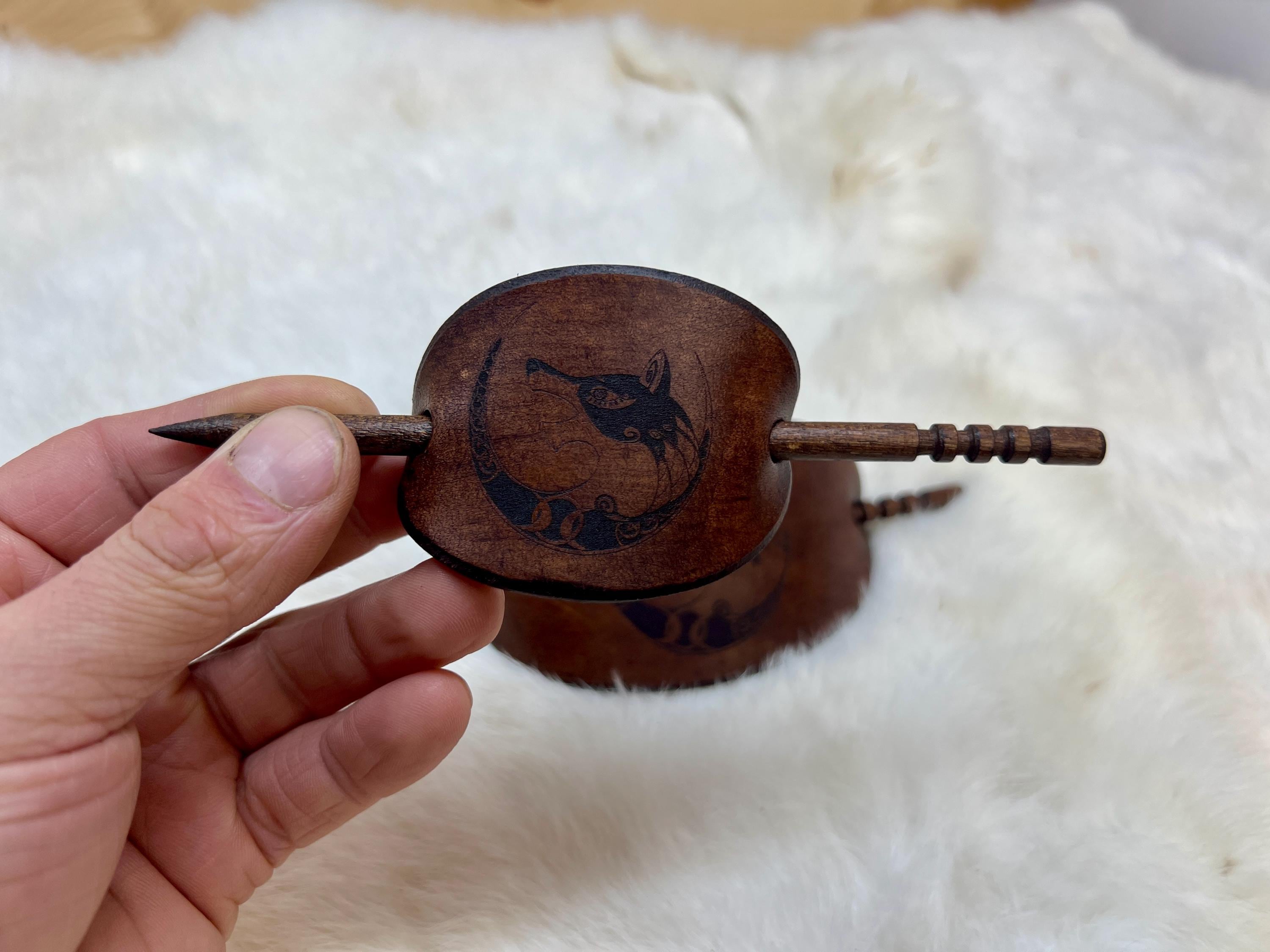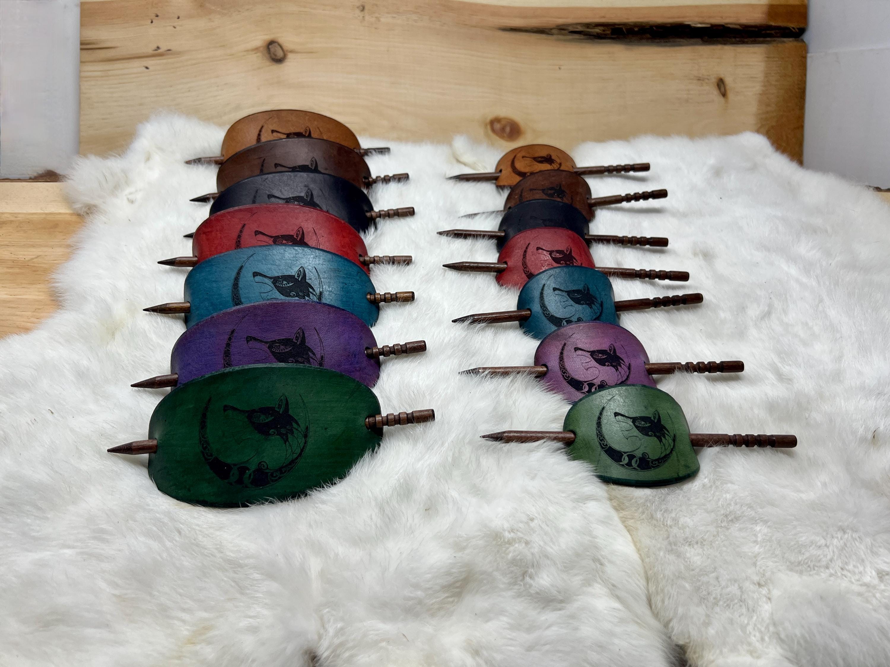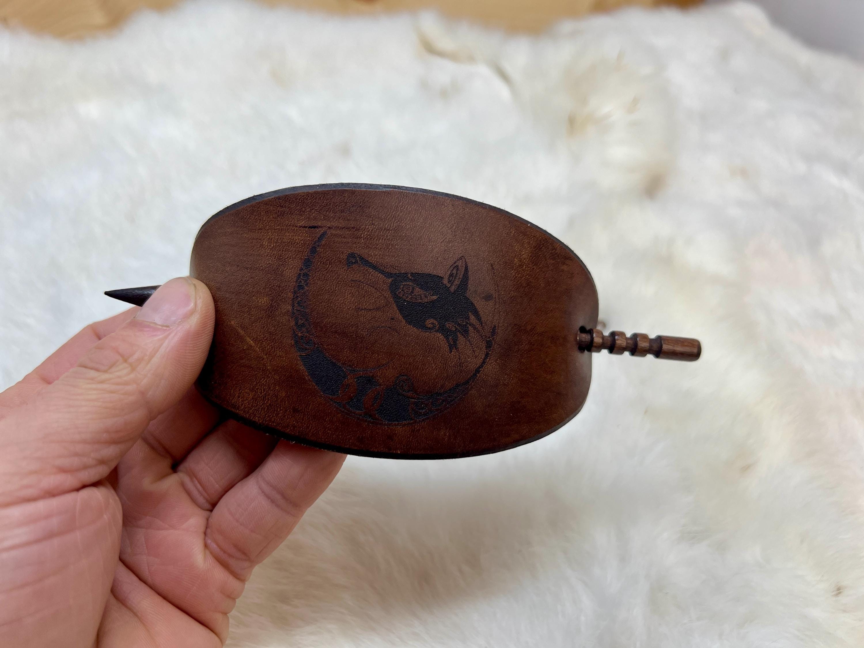 - Leather hair pin engraved with a unique Wolf Howling in a Crescent Moon art