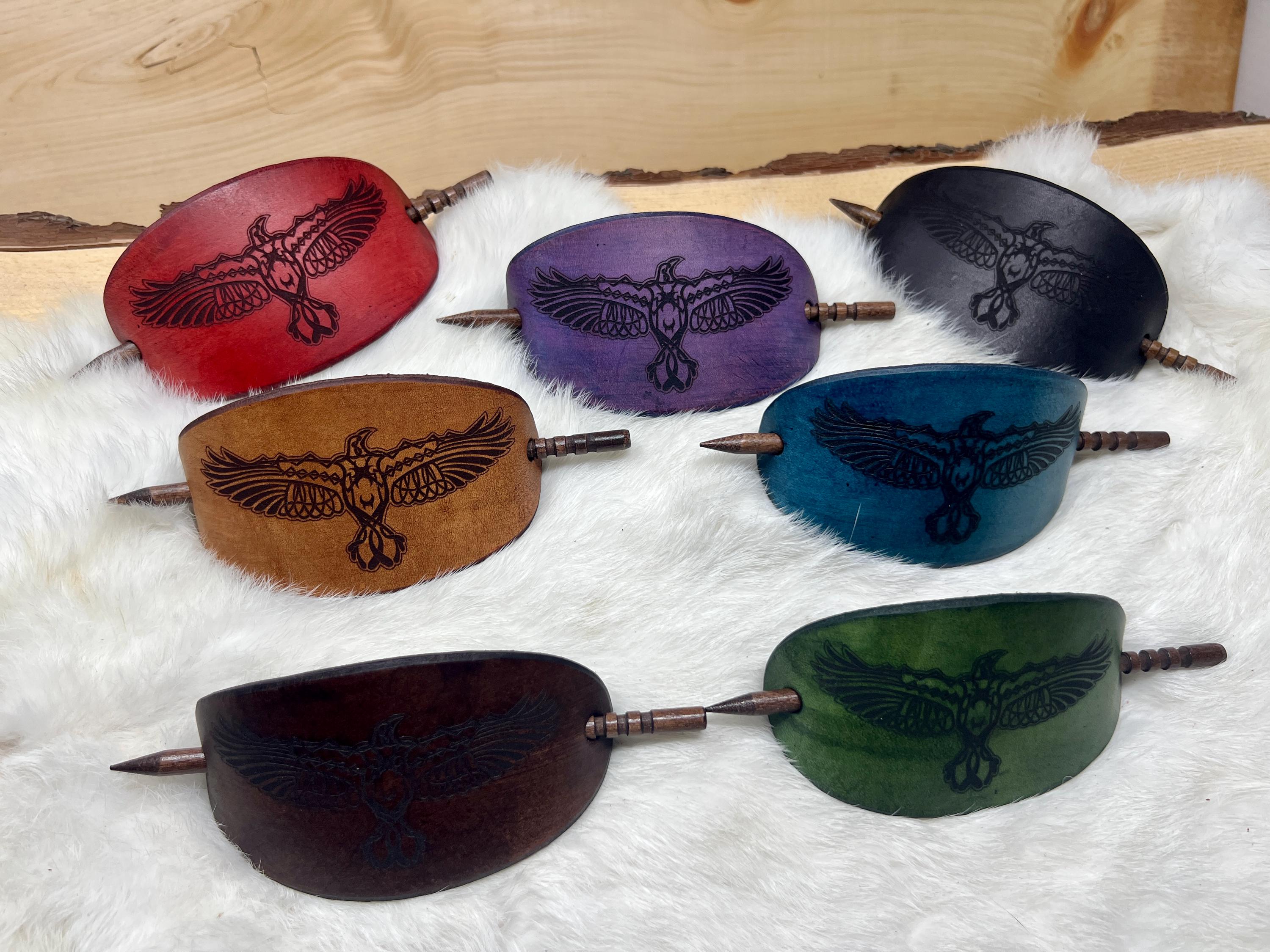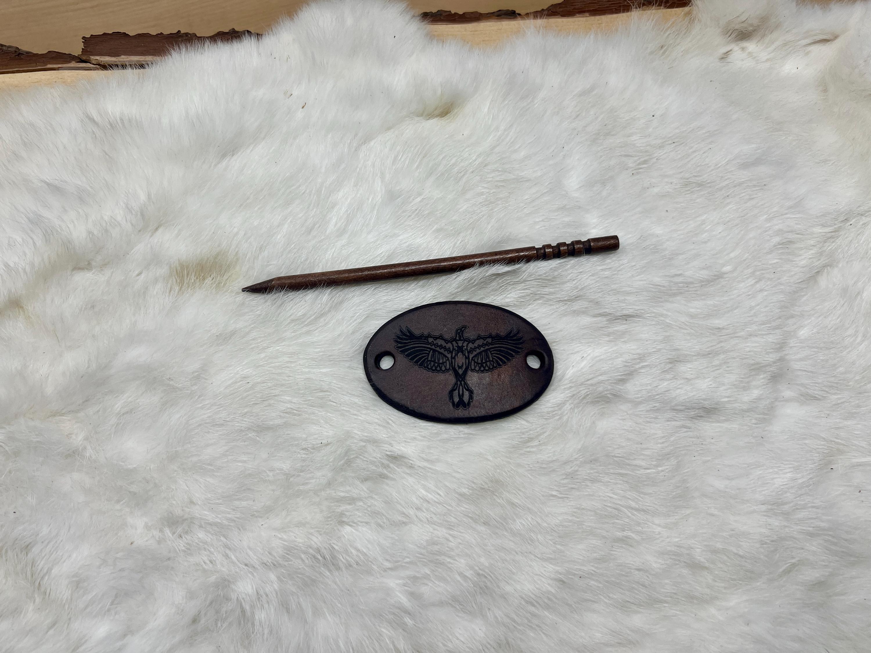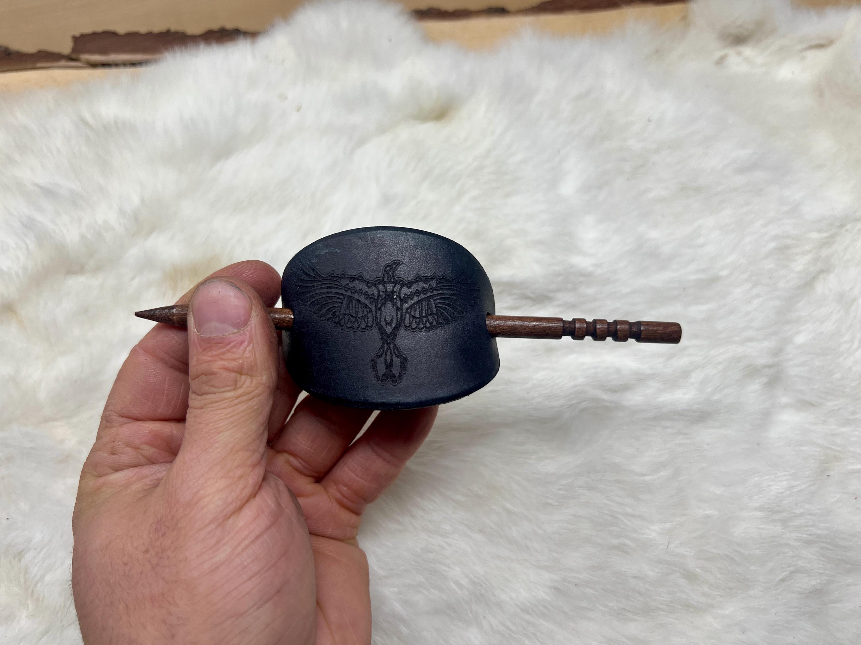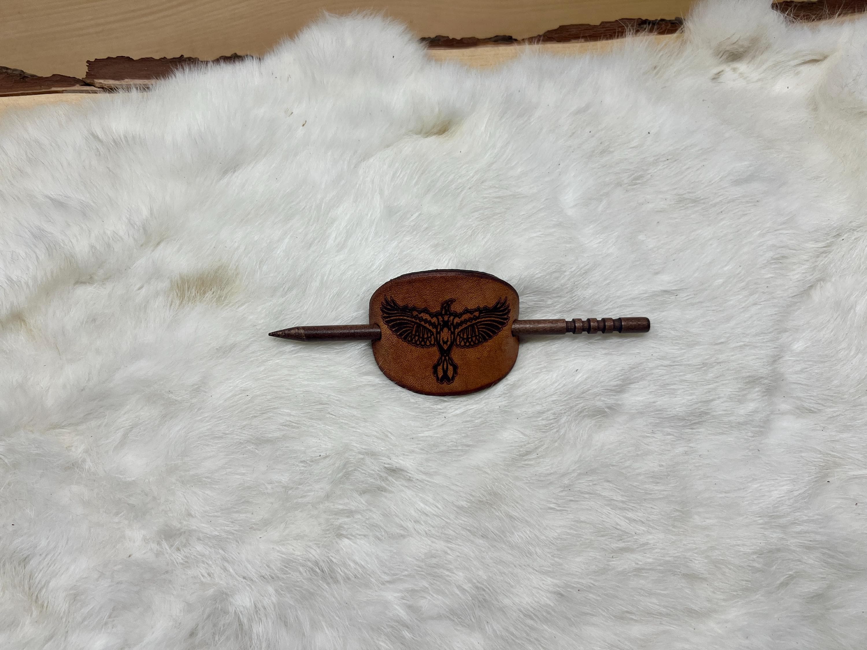 - Leather hair pin engraved with a beautiful spread wing Raven design