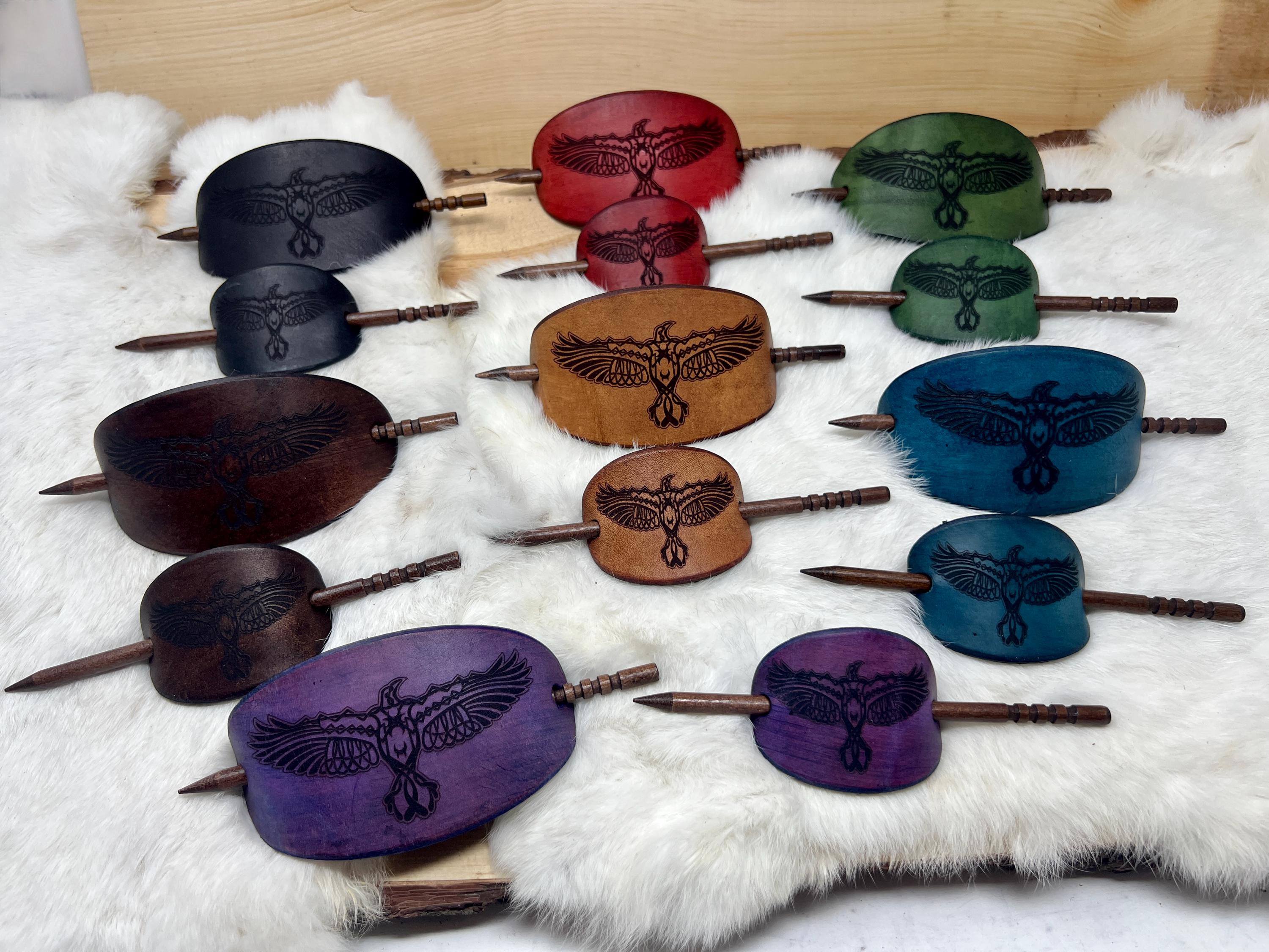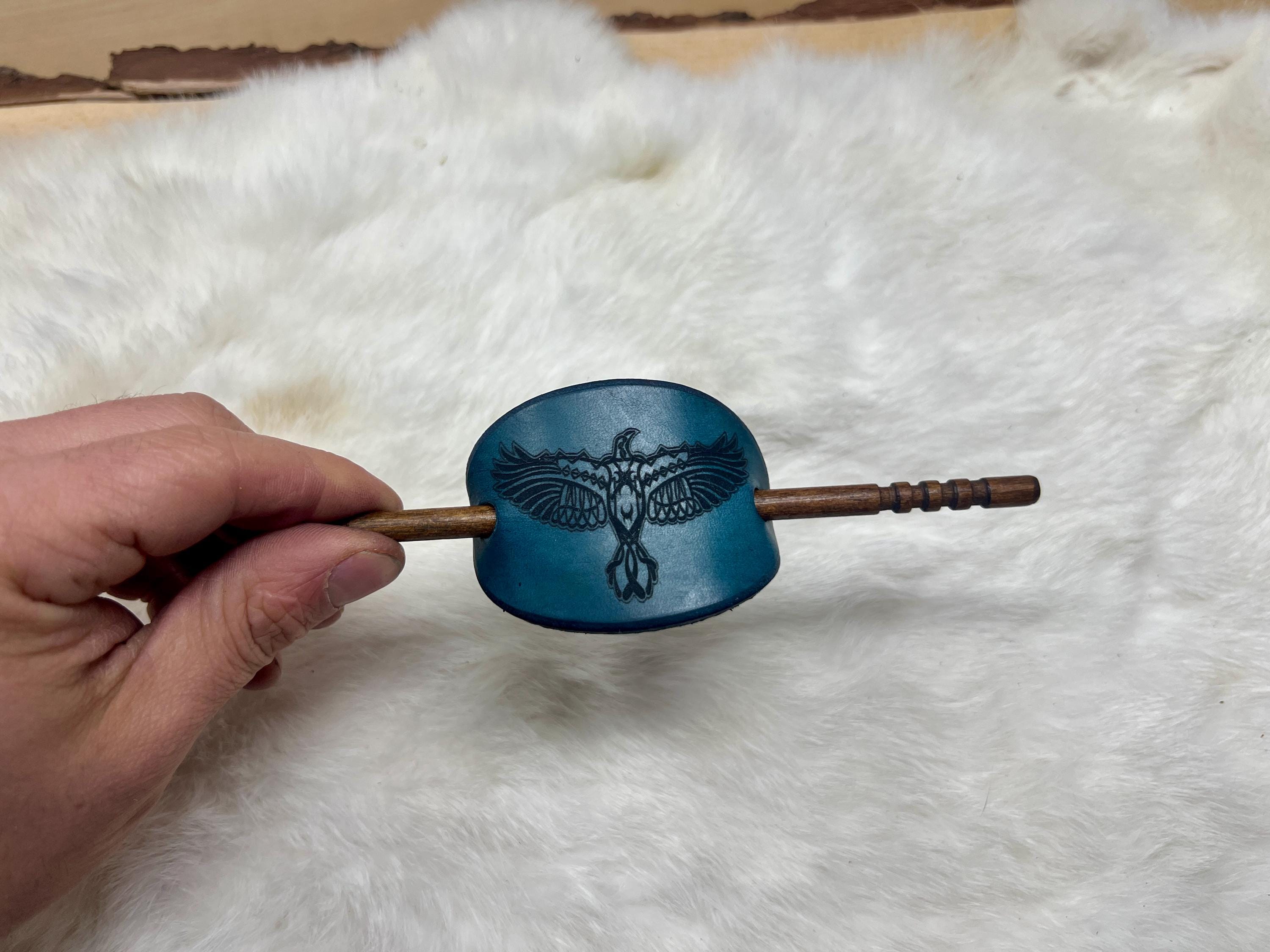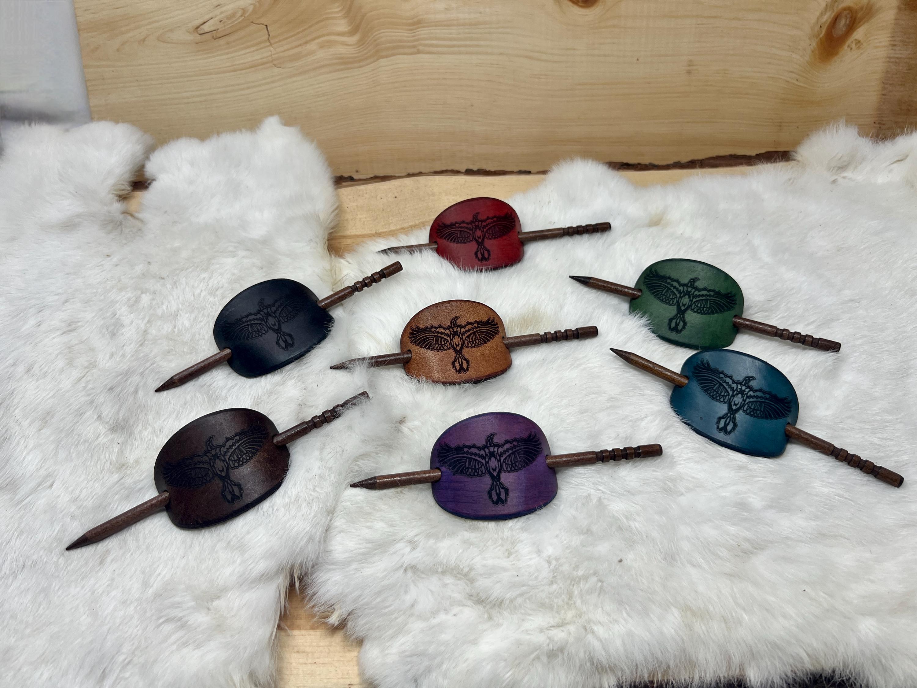 - Leather hair pin engraved with a beautiful spread wing Raven design