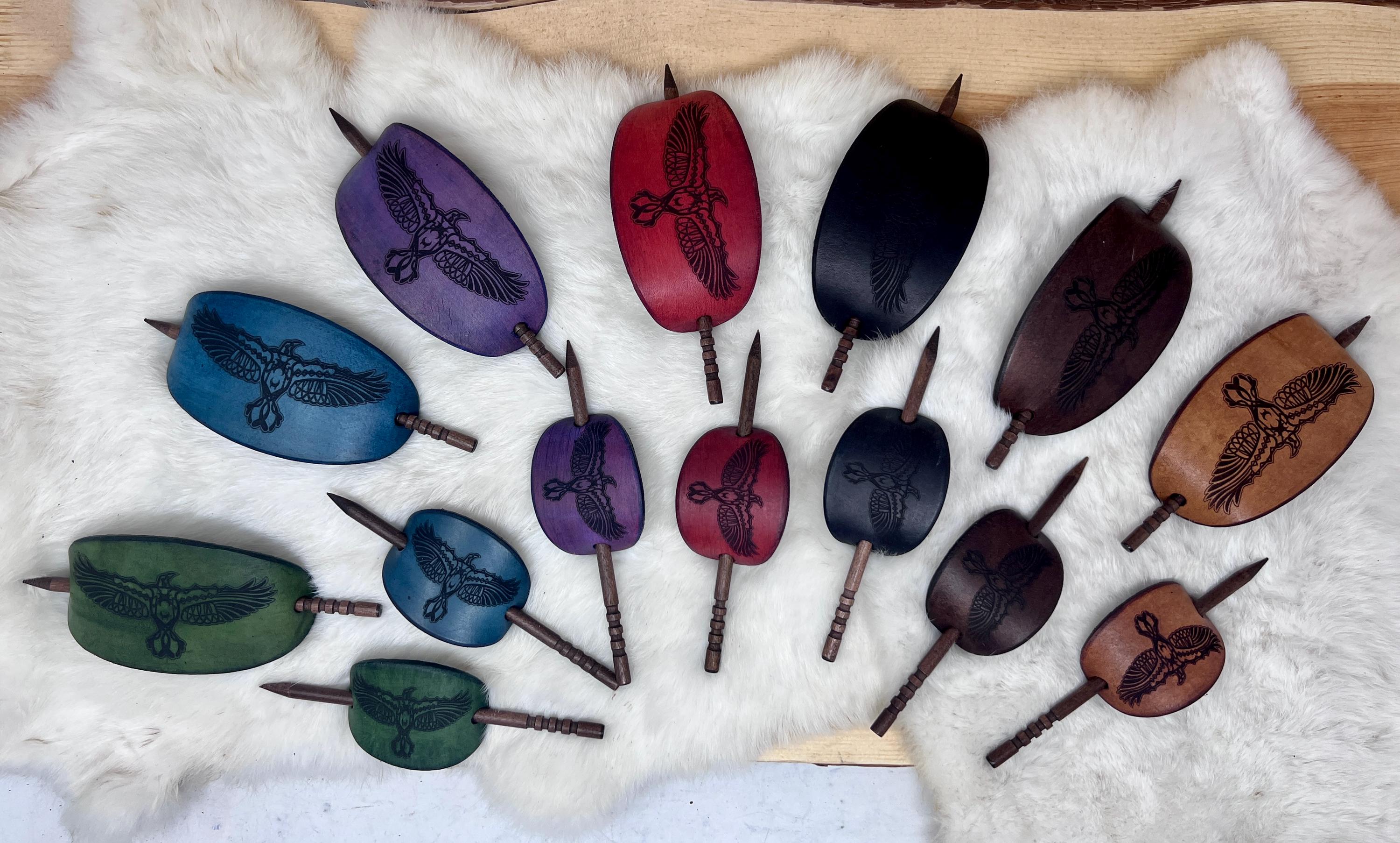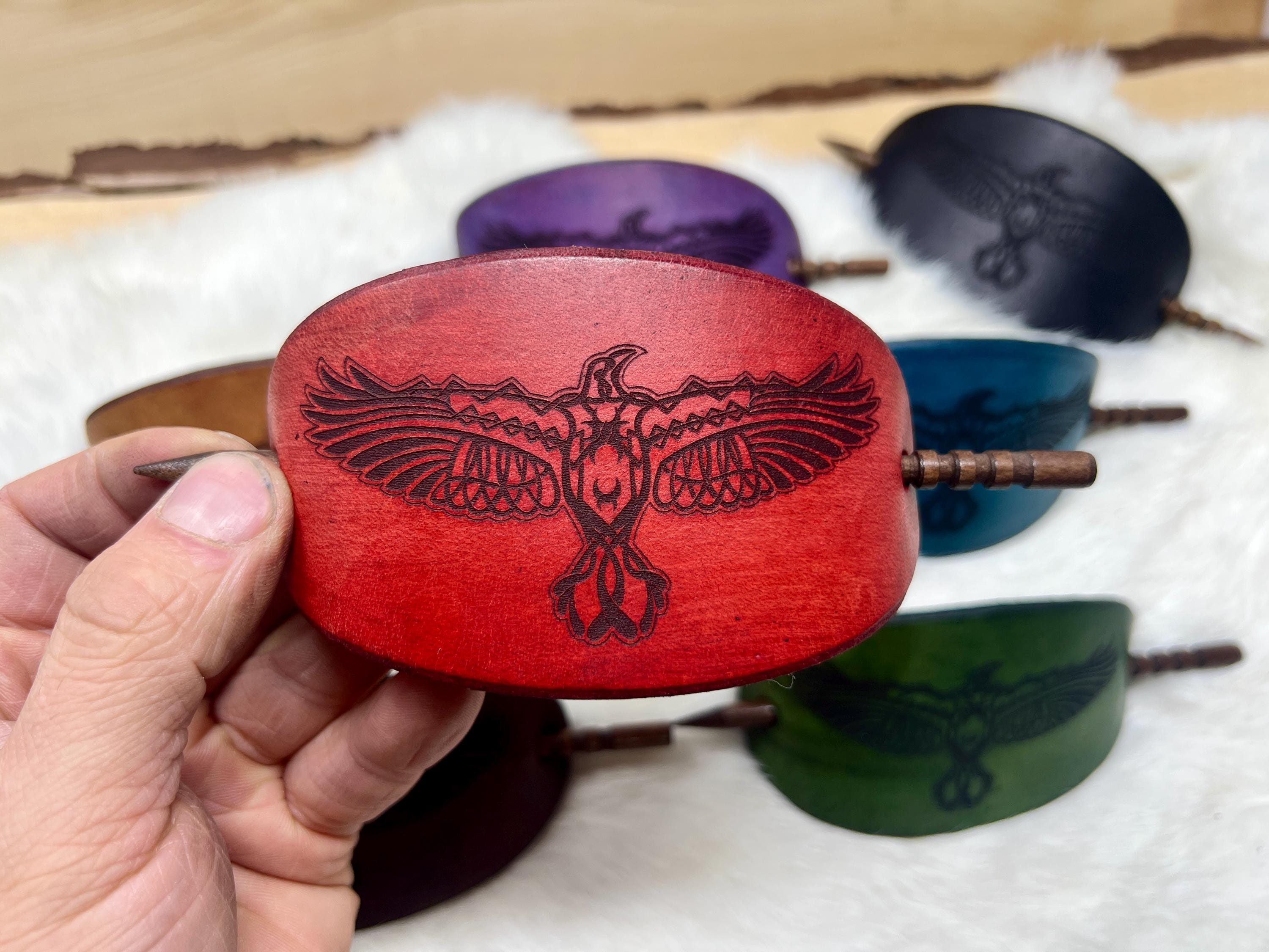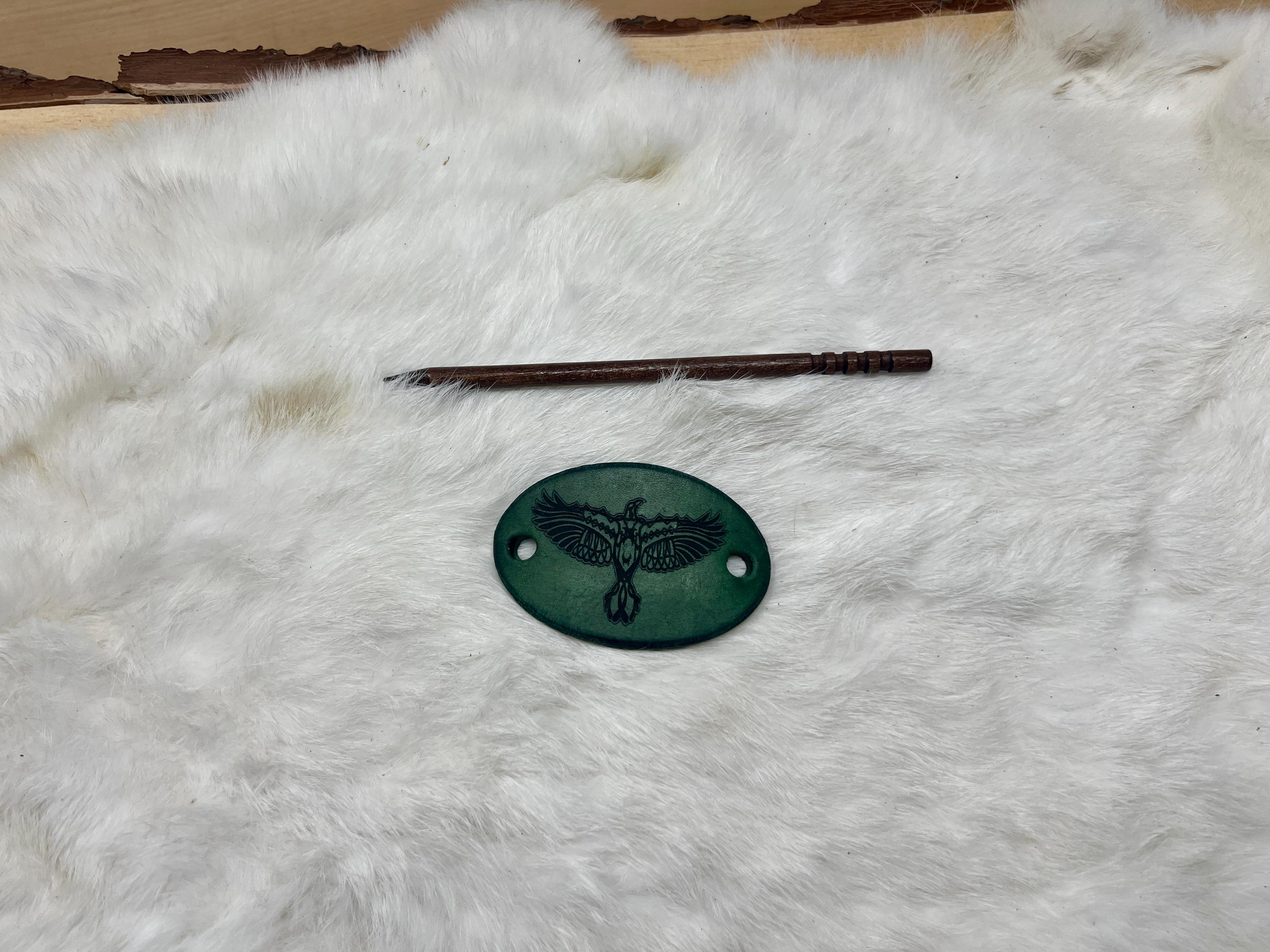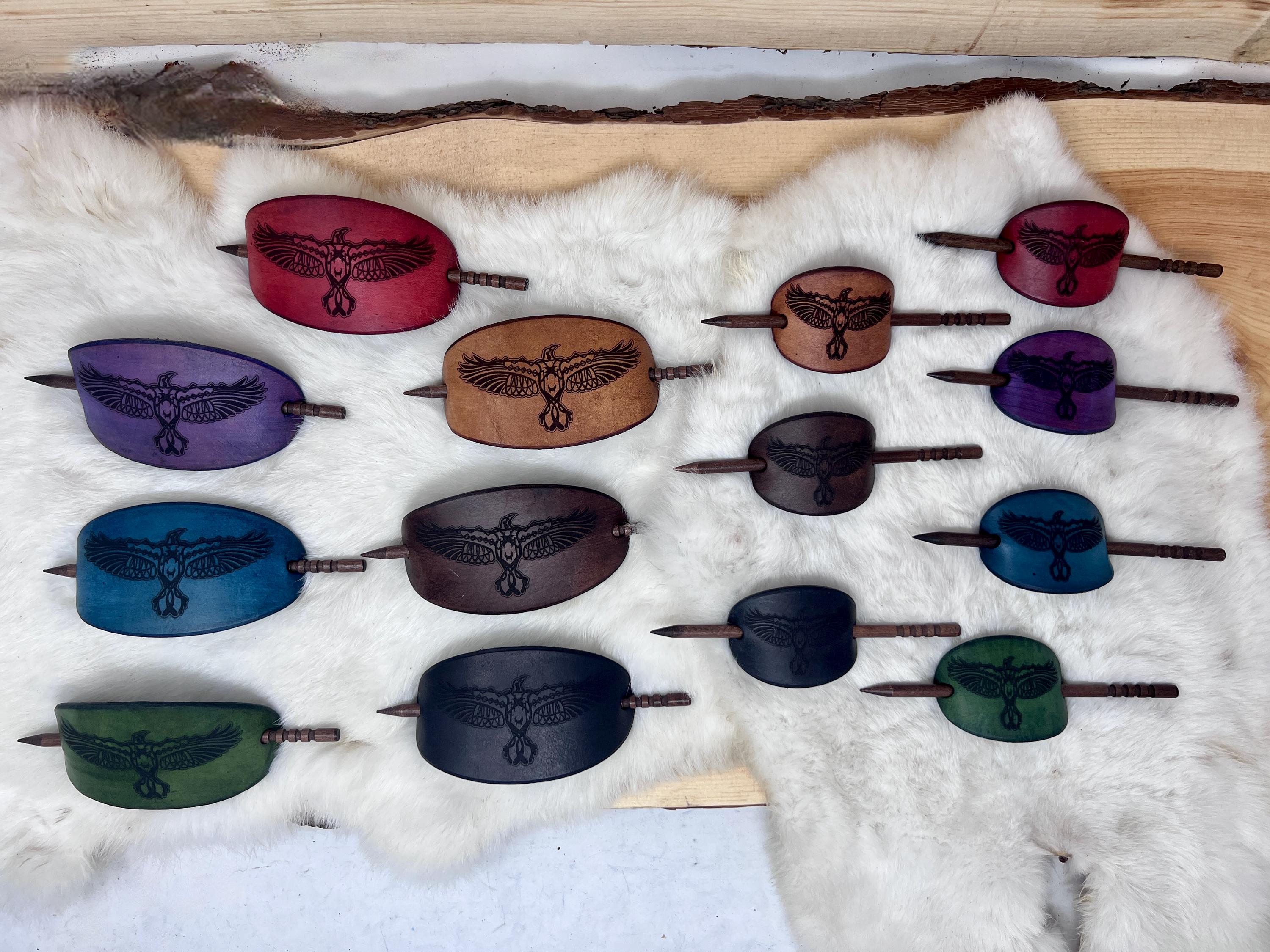 - Leather hair pin engraved with a beautiful spread wing Raven design