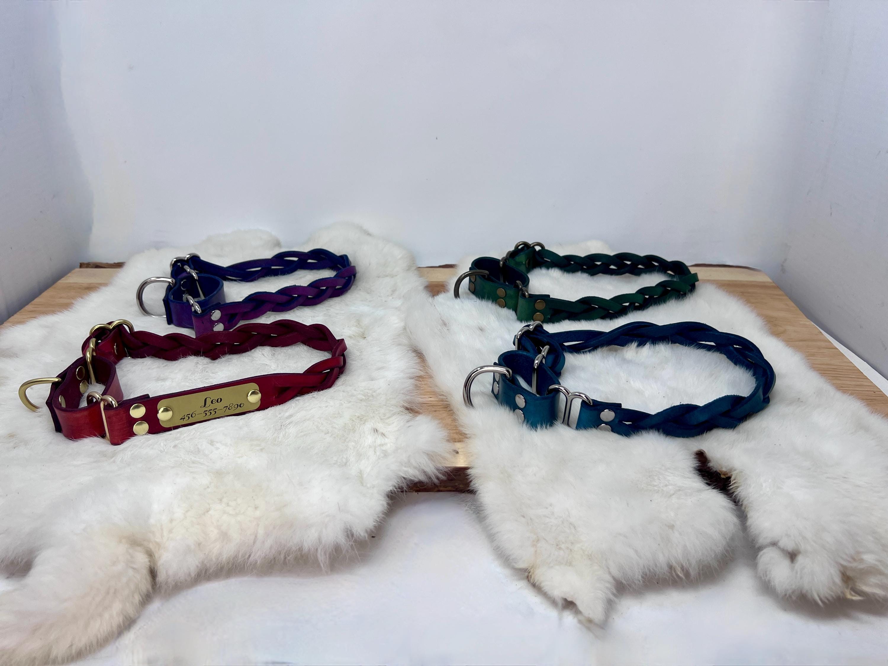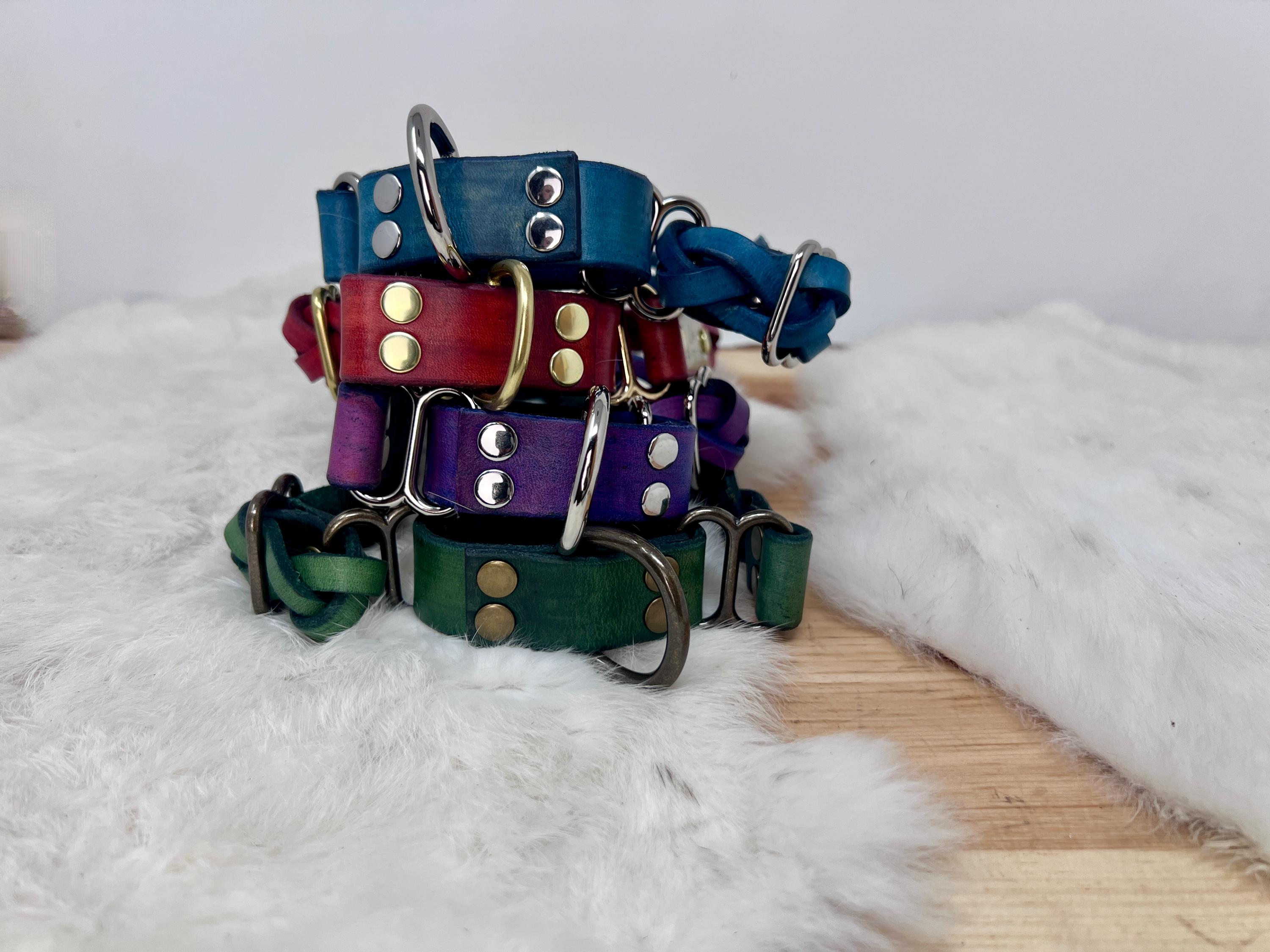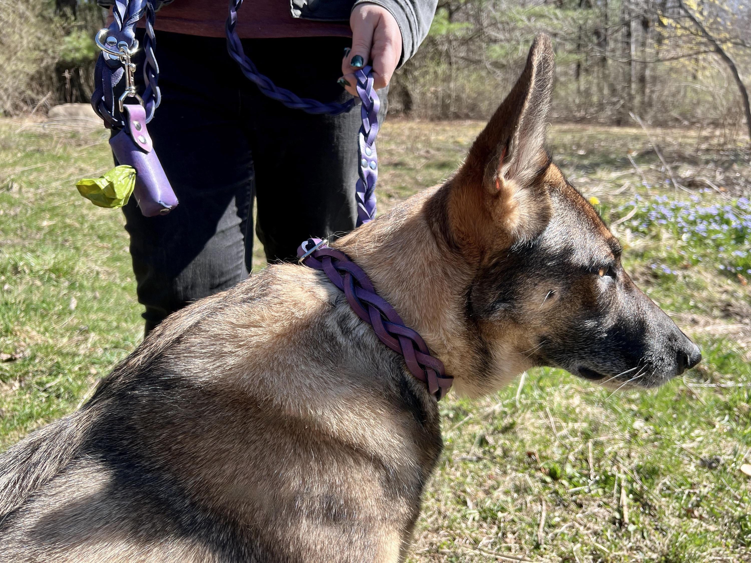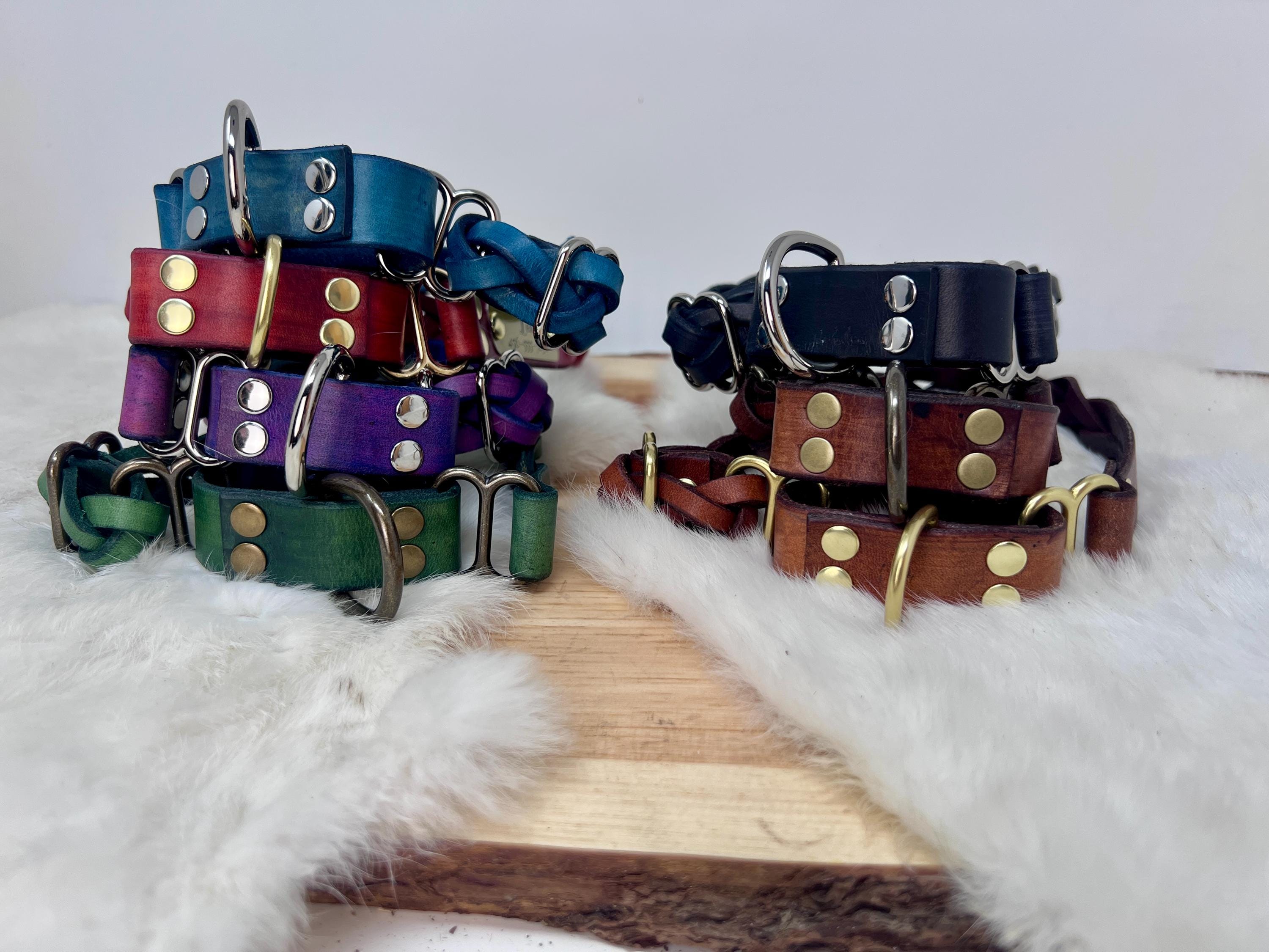 - Customize your pup's style with brown, black, blue, green, red, or purple leather colors