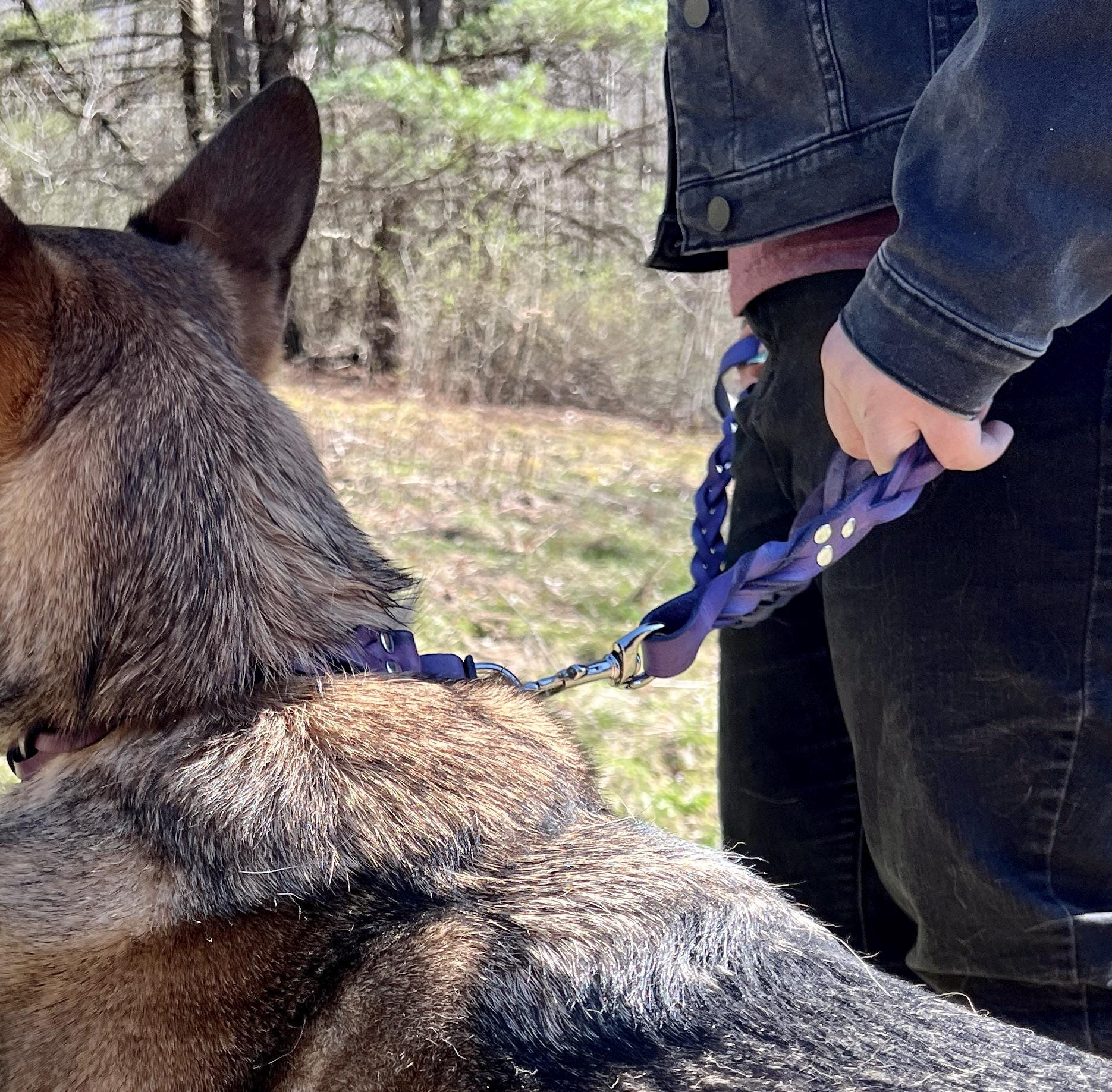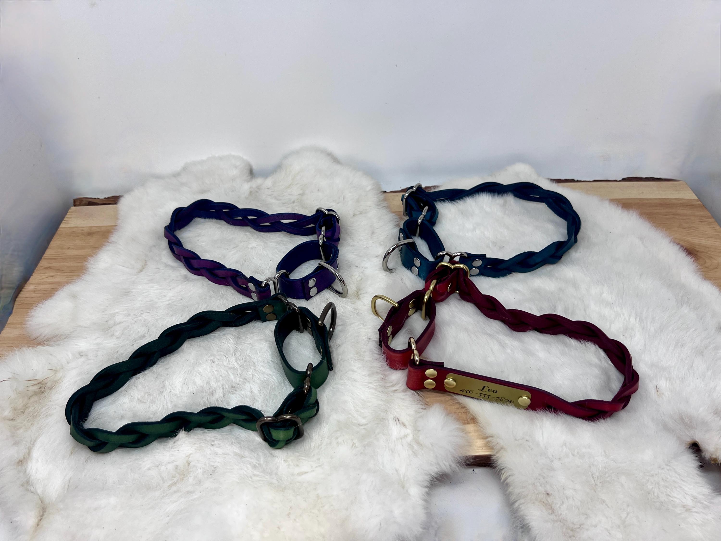Inspired by reins and tack used in horseback riding, this collar is made from one whole piece of leather that's cut in the center and fold braided. We find that this style of braiding results in a collar for your pup that's as strong as the original piece (and that's pretty strong).