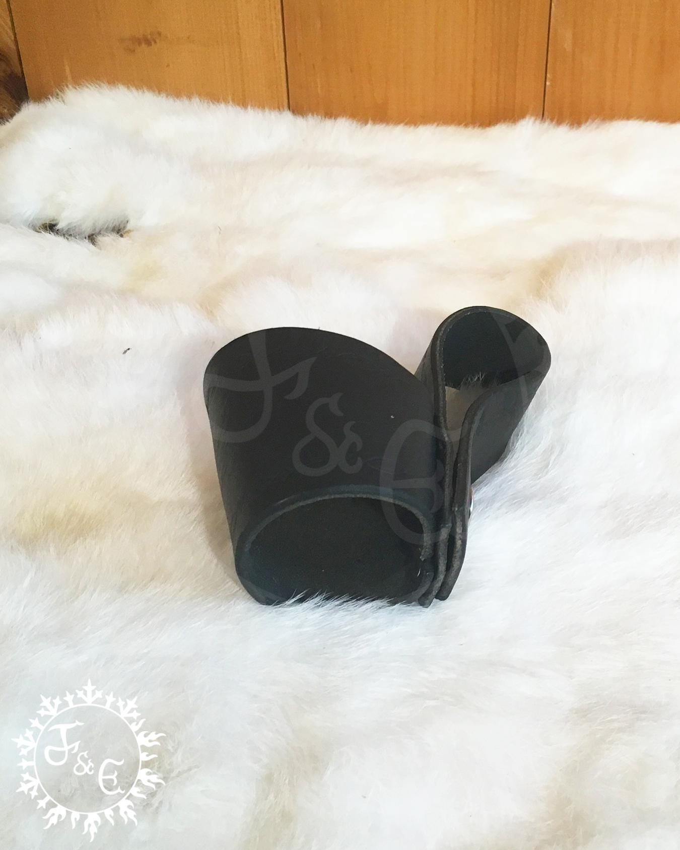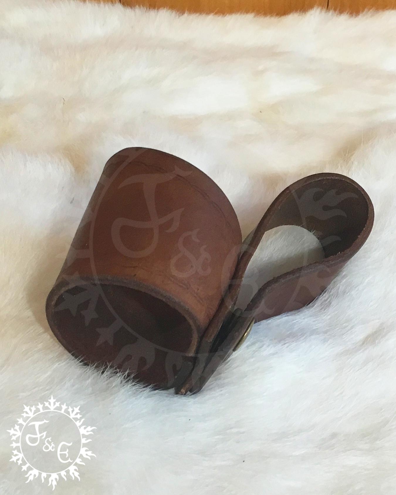 Hand-cut from thick leather, each horn holder has a snap on the back to make it easy to hang on your belt without undoing your entire garb! Customize your horn holder with optional celtic weave stamping and your choice of bronze, gold, or silver metal.