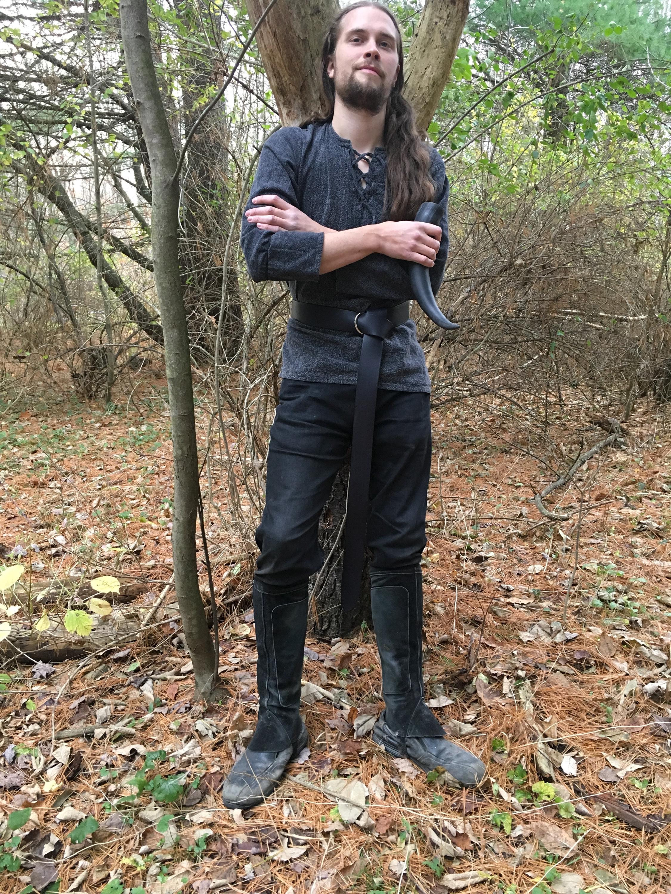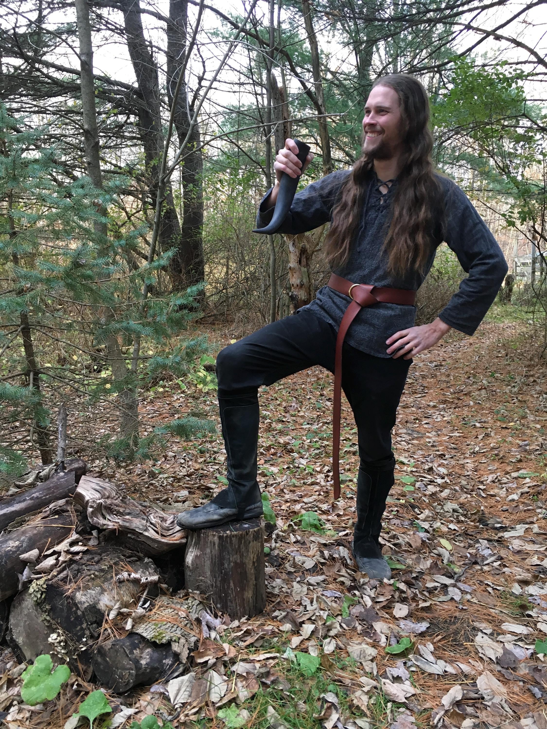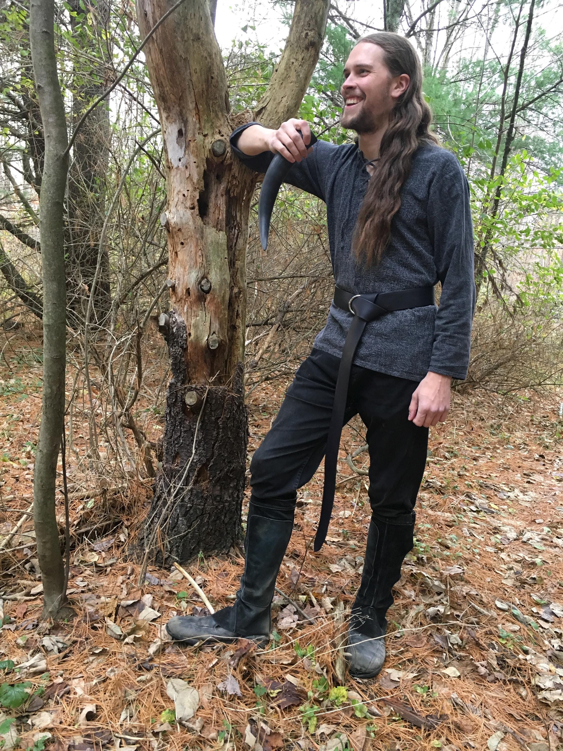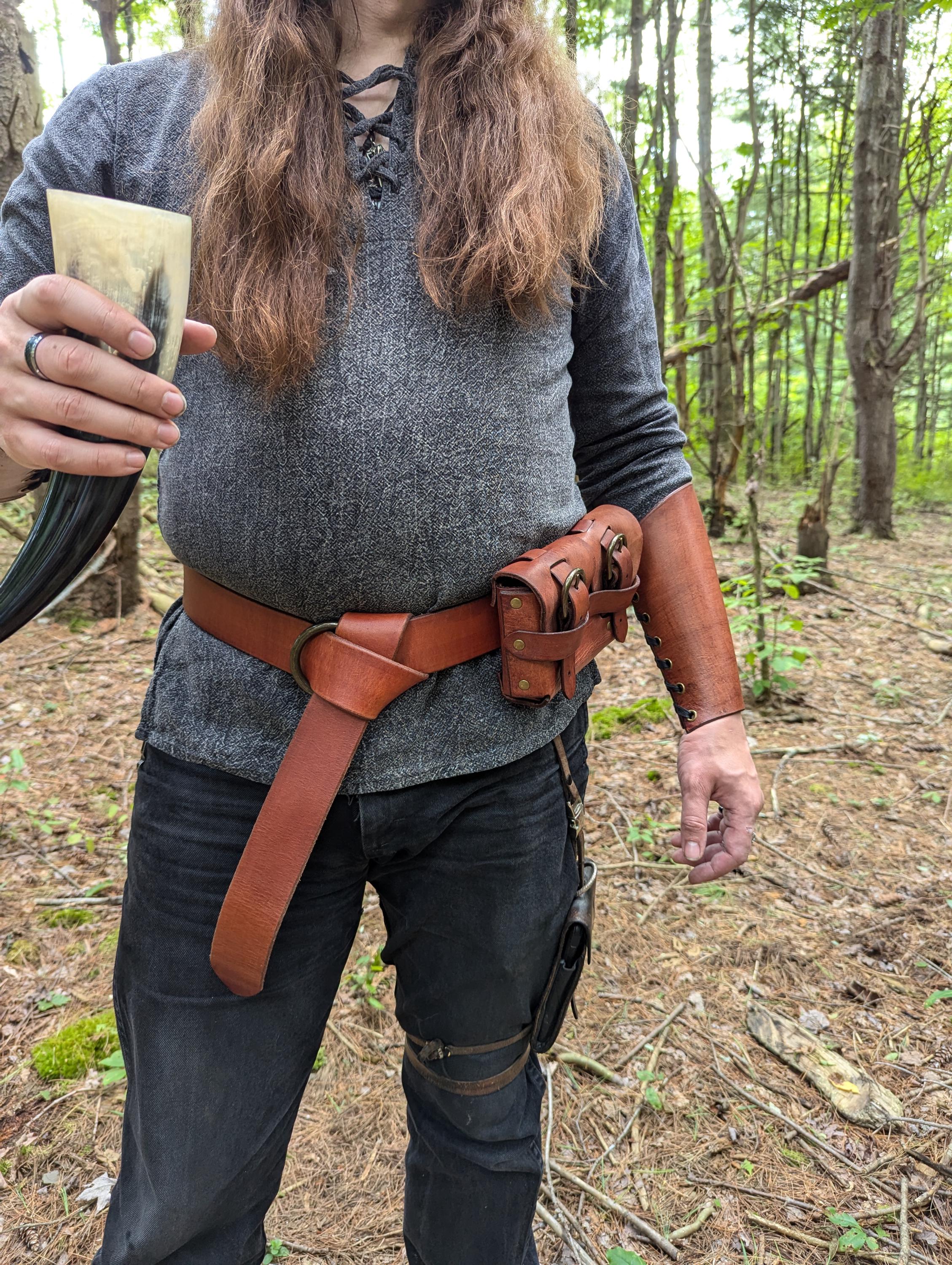 Match your garb with brown, black, fawn, tan, green, blue, purple, or red leather color! Customize for a one-of-a-kind belt with bronze, gold, or silver front ring!