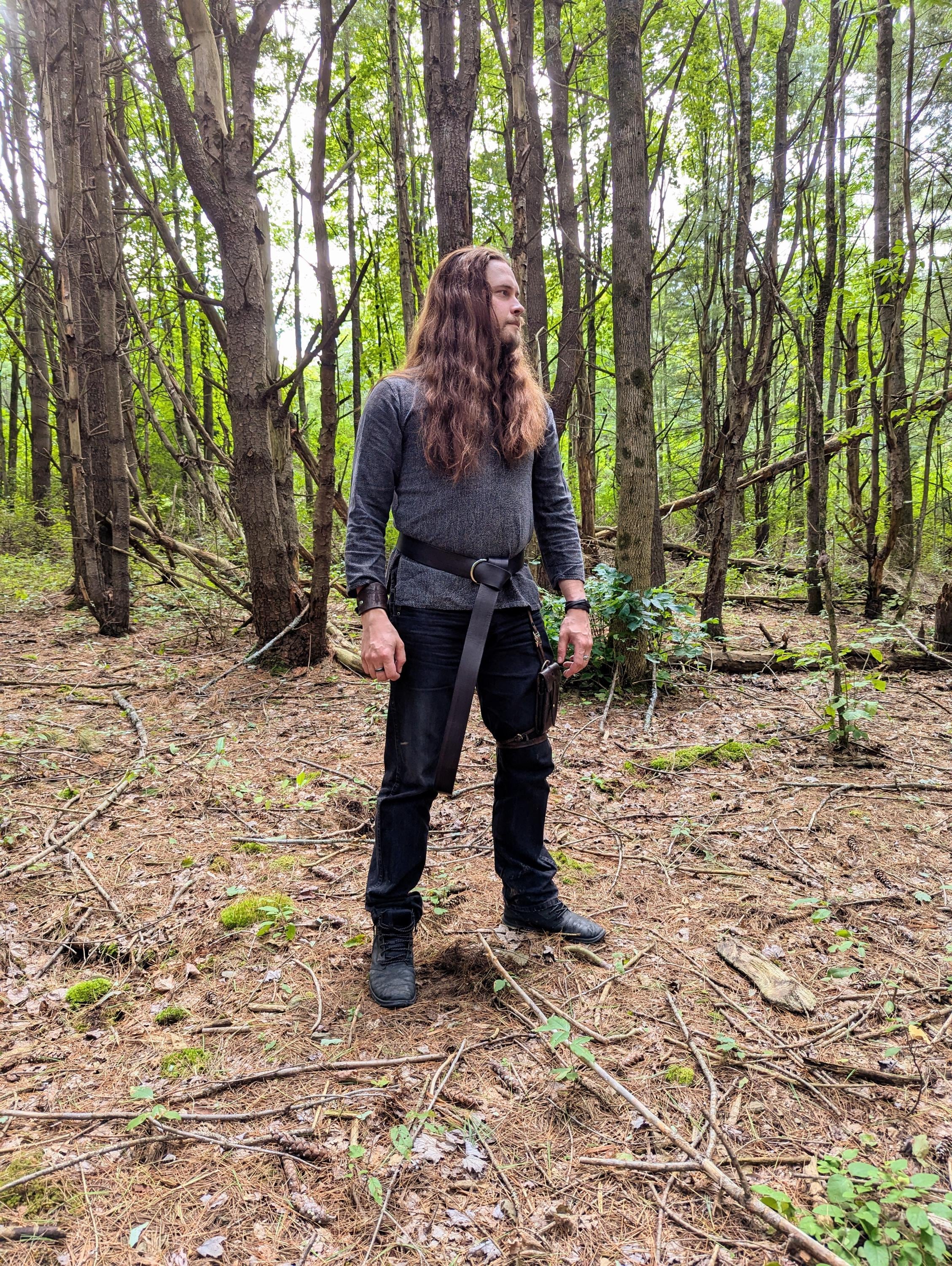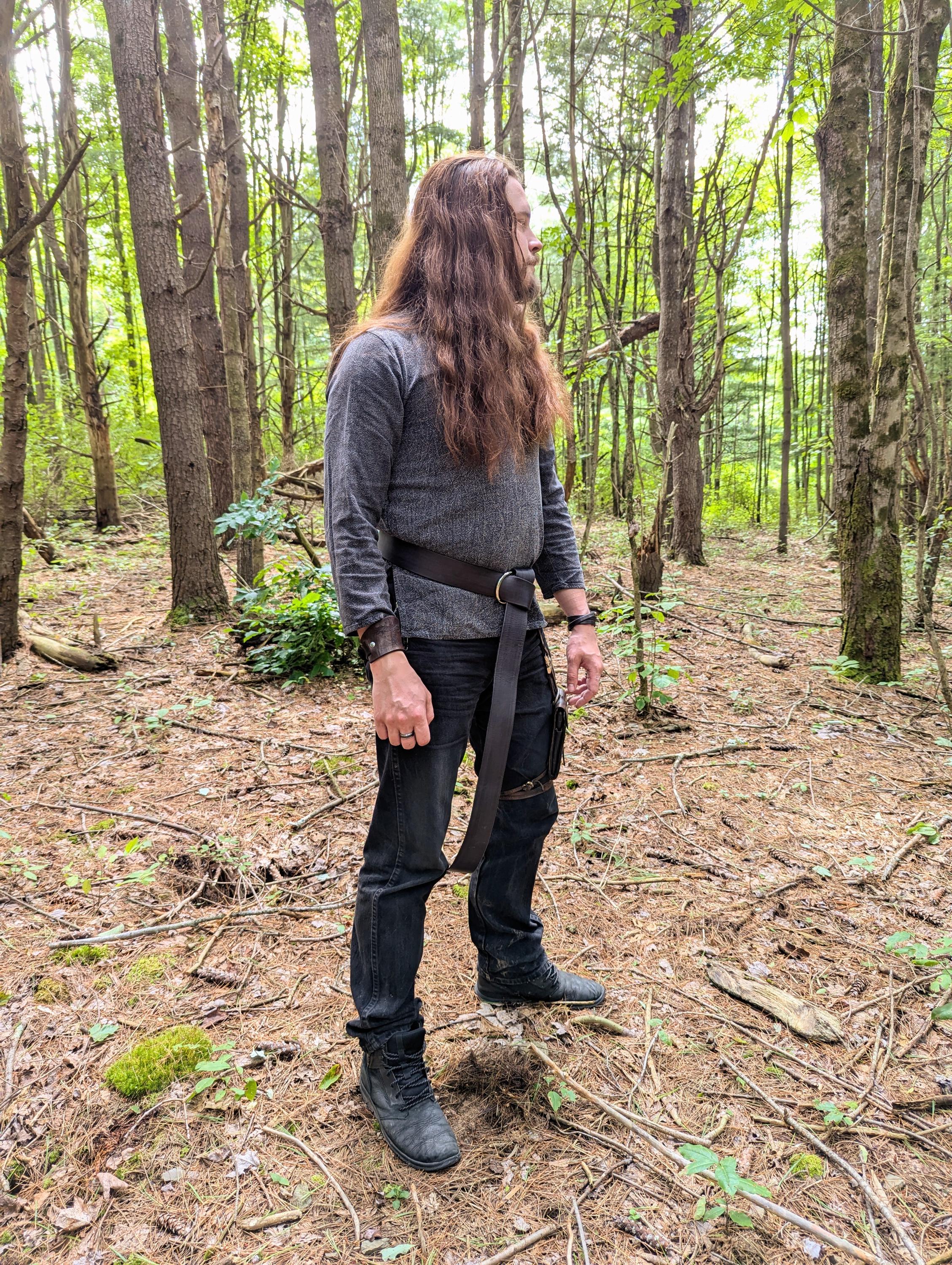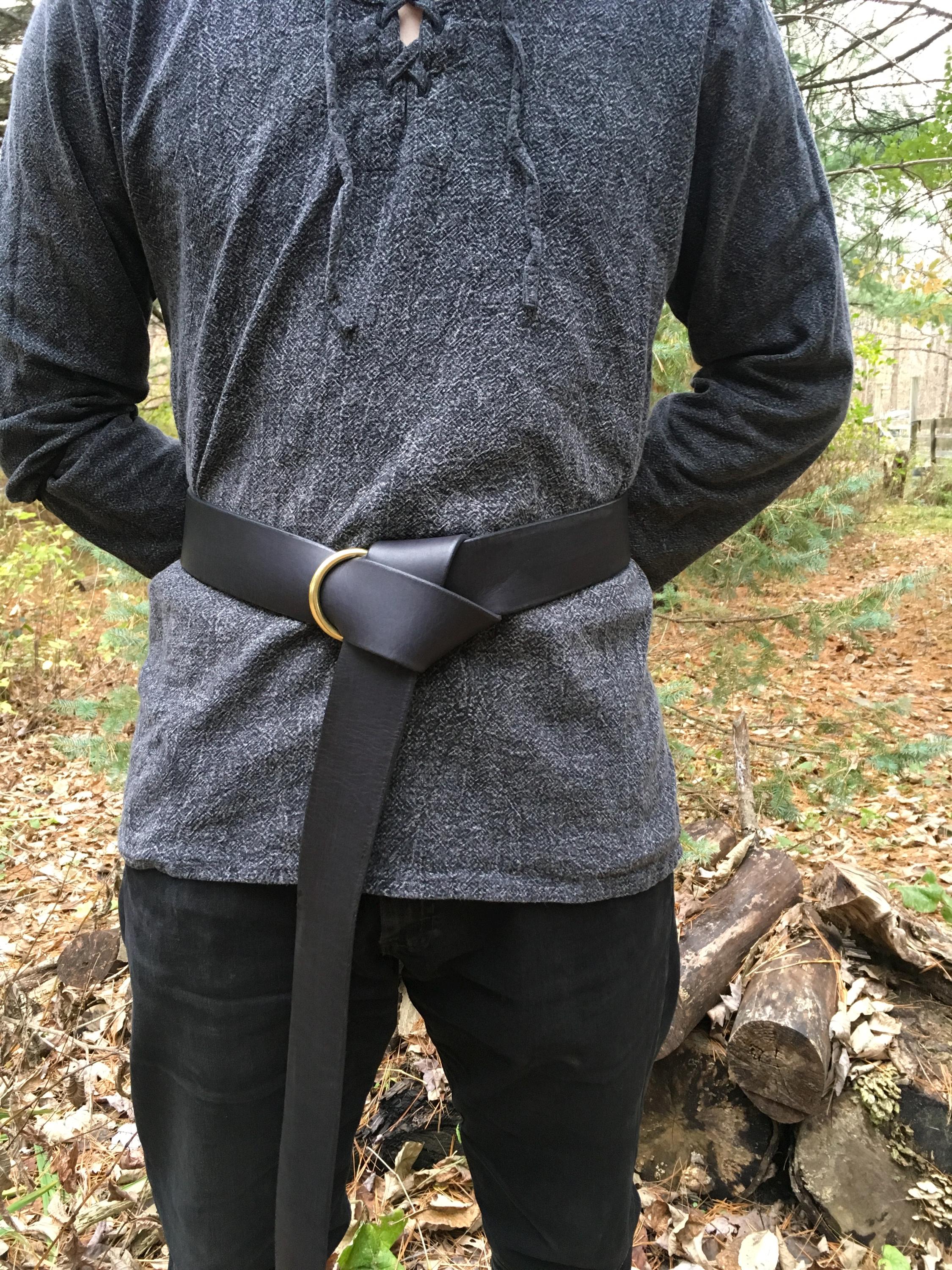 Bring together your garb with a strong, wide leather ring belt! Whether you're downing an ale at the inn or you're searching through the forest, you need a belt to hold your gear (and your trousers up!). Your belt can be customized with your choice of gold, bronze, or silver front ring. We handcraft each belt individually from high quality leather.