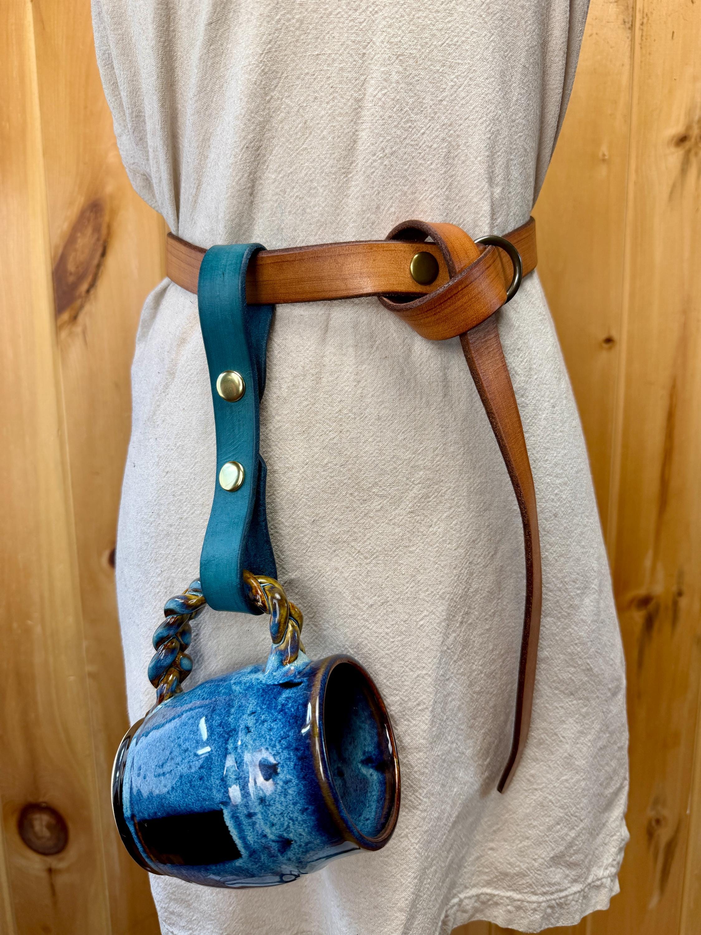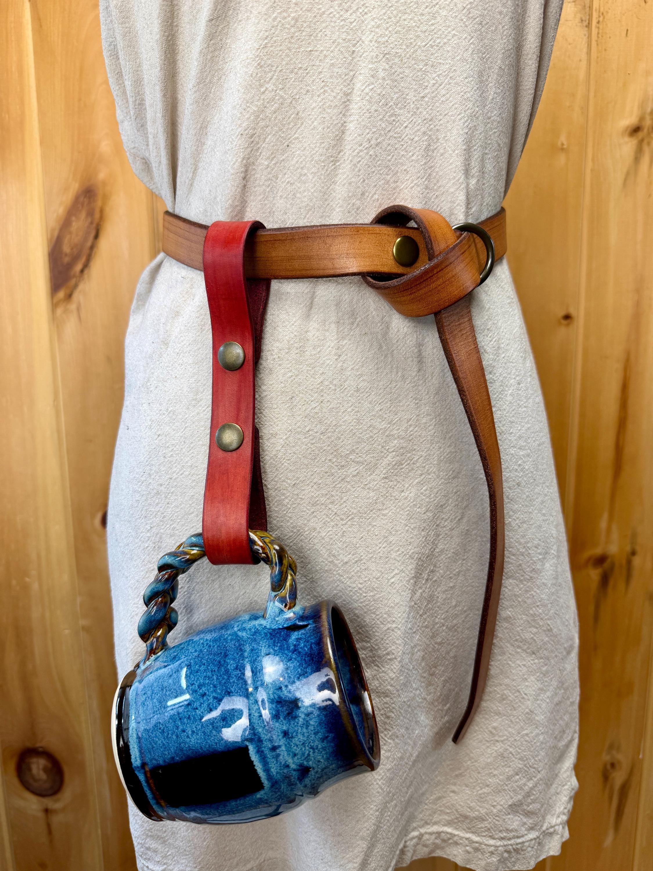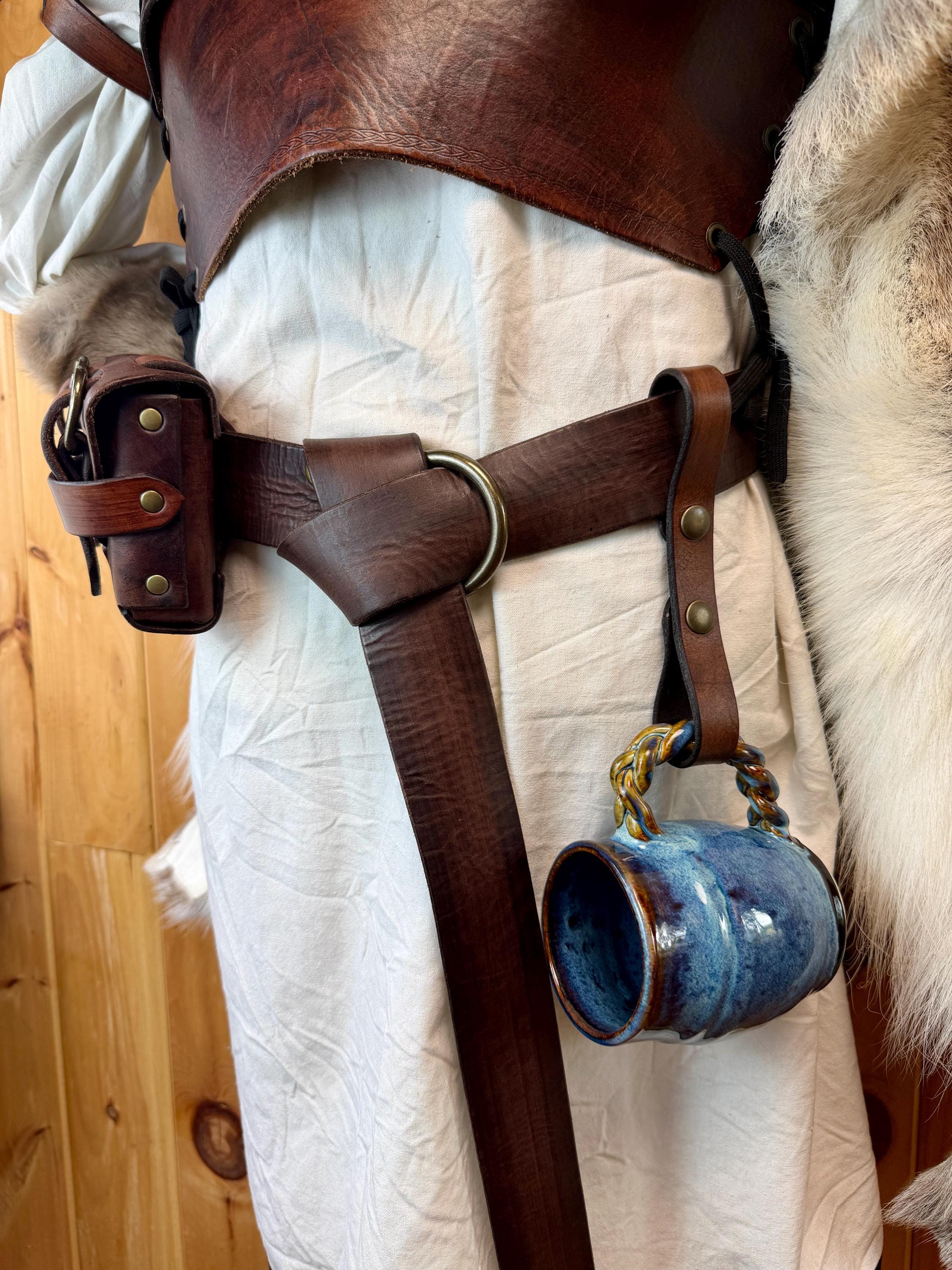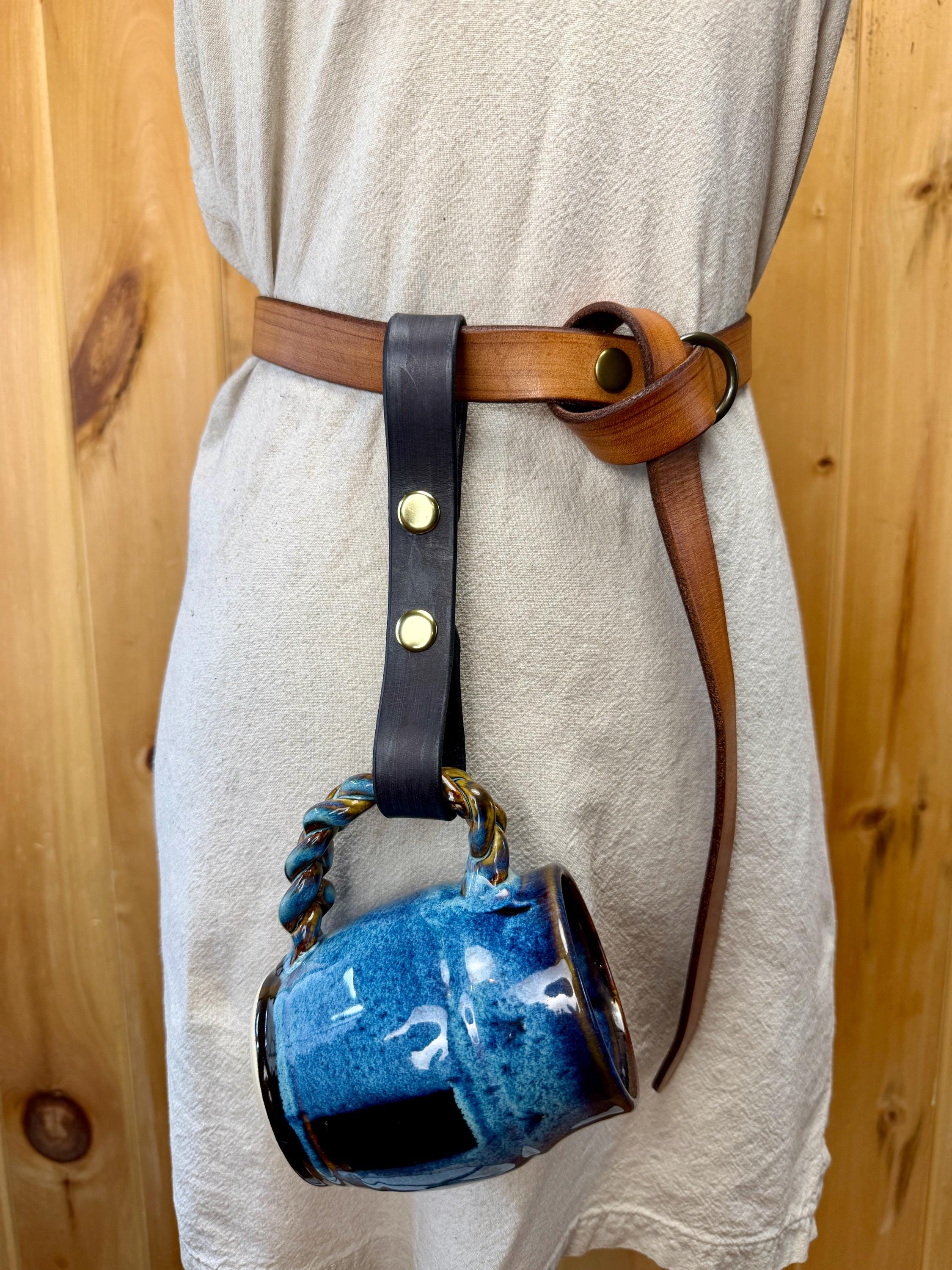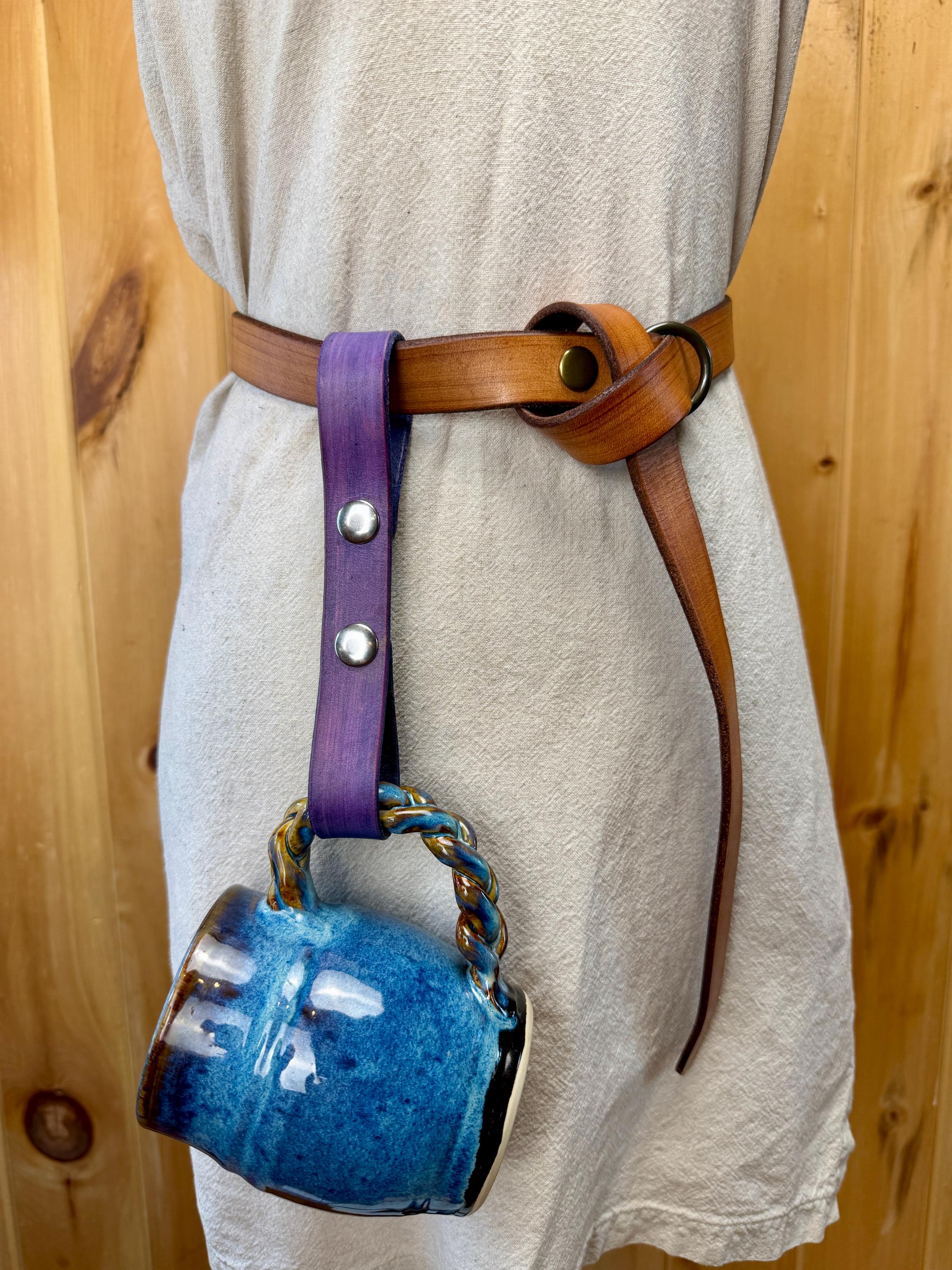 Keep your mug close at hand just in case someone ever offers you a free drink! Made with two snaps, your tankard holder will be easy to snap to your belt without taking apart your whole garb! Unsnap the bottom loop to hang the handle of your clay mug, metal tankard, or horn cup.